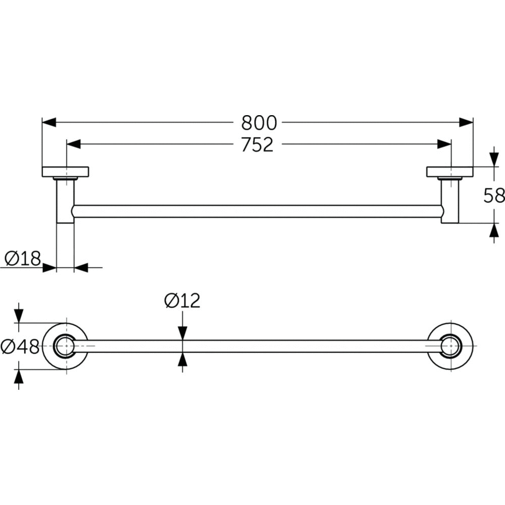 Uchwyt na ręcznik, 80 cm. Średnica rurki 12 mm. W komplecie z zestawem montażowym. Wymiary: 800 mm x 58 mm x 48 mm, 0,80 kg.