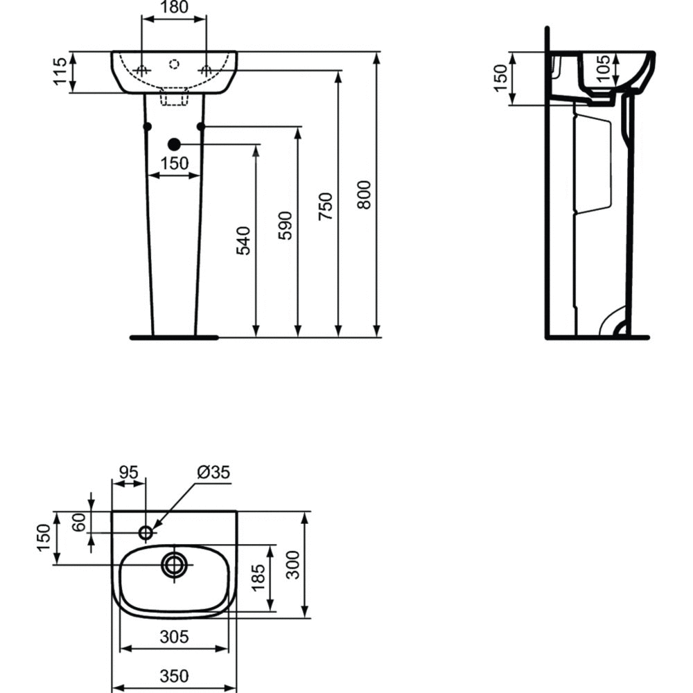 Umywalka do mycia rąk z wybitym otworem na baterię po lewej stronie oraz z przelewem. Do montażu z małym postumentem T471401 lub samodzielnie z syfonem.