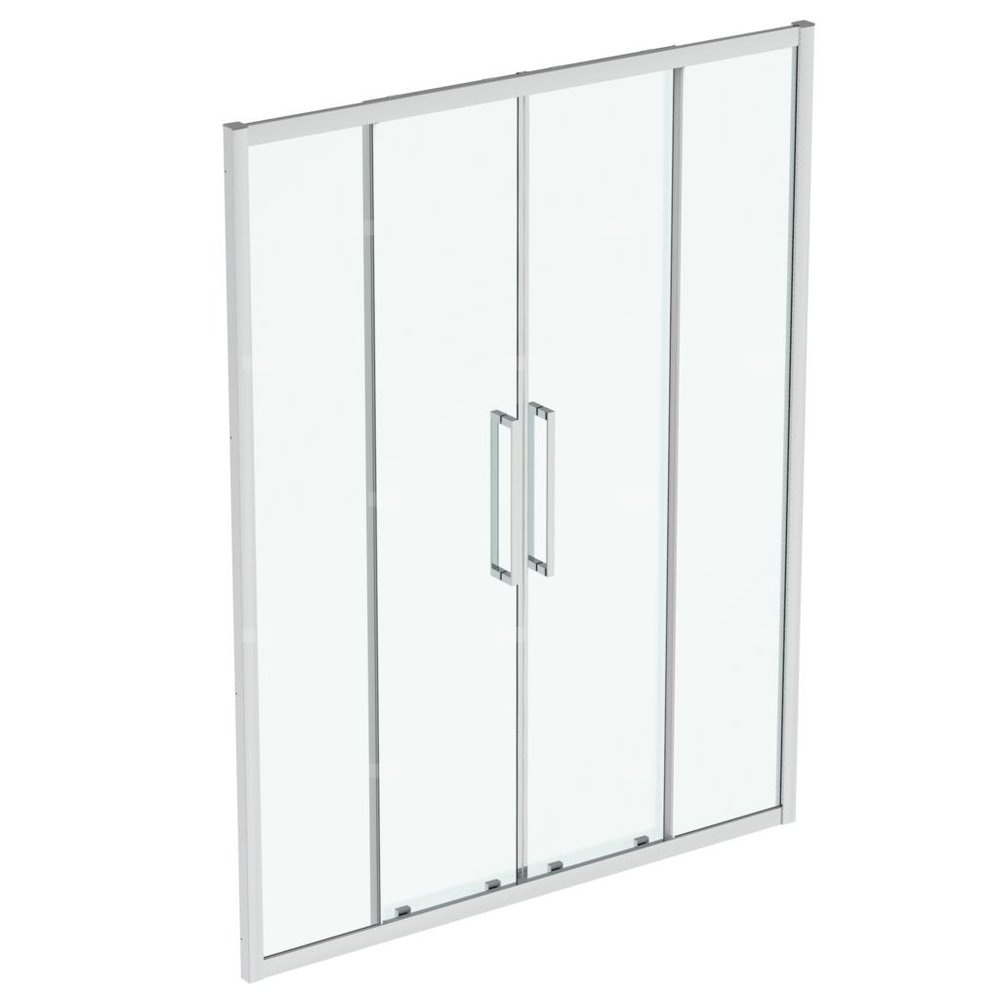 Dwoje drzwi prysznicowych przesuwnych z dwoma panelami bocznymi. Wykonane z bezpiecznego transparentnego szkła 8 mm z powłoką Ideal Clean zabezpieczającą przed osadzaniem się kamienia. Profile aluminiowe o grubości 1,2 mm. Rozciągliwość 20 mm na profil. Zastosowanie systemu podwójnych kółek na górze z systemem szybkiego zamykania na dole. Brak mechanizmu samodomykania "soft close". Przeznaczony do montażu we wnęce (ściana do ściany) lub w narożniku (z panelem bocznym typu L). Do montażu z brodzikami Ideal Standard lub bezpośrednio na płytkach. Wszystkie produkty z linii są odwracalne. Więcej informacji oraz rekomendowanych rozwiązań znajduje się w katalogu lub cenniku.