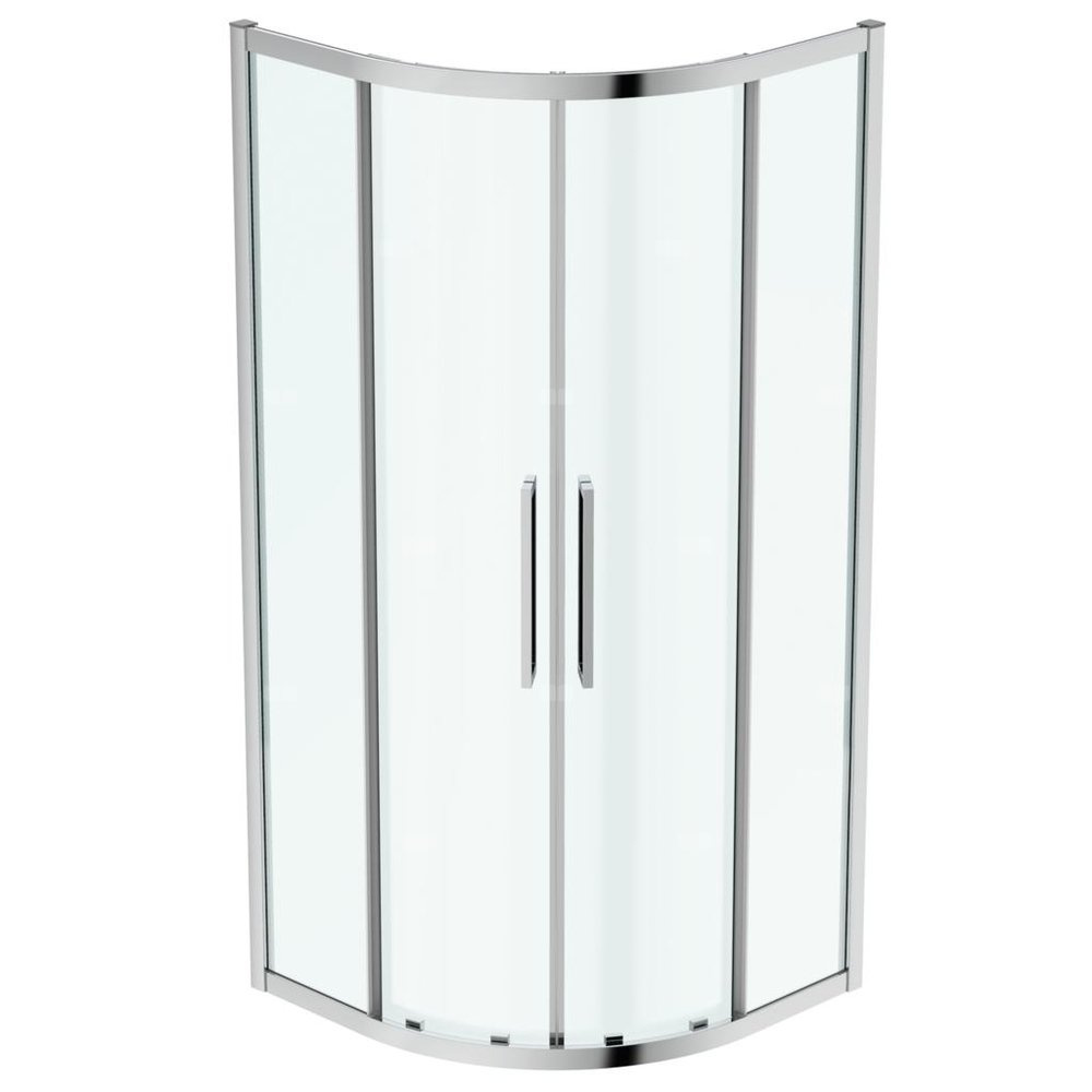 Kabina prysznicowa narożna półokrągla (pełny komplet), z drzwiami przesuwnymi, promień 55 cm. Wykonane z bezpiecznego transparentnego szkła 8 mm z powłoką Ideal Clean zabezpieczającą przed osadzaniem się kamienia. Profile srebrne aluminiowe o grubości 1,2 mm. Zastosowanie systemu podwójnych kółek na górze z systemem szybkiego zamykania na dole.Rozciągliwość 20 mm na profil. Do montażu z brodzikami Ideal Standard o dostosowanych wymiarach lub bezpośrednio na płytkach. Wszystkie produkty z linii są odwracalne. Więcej informacji oraz rekomendowanych rozwiązań znajduje się w katalogu lub cenniku.