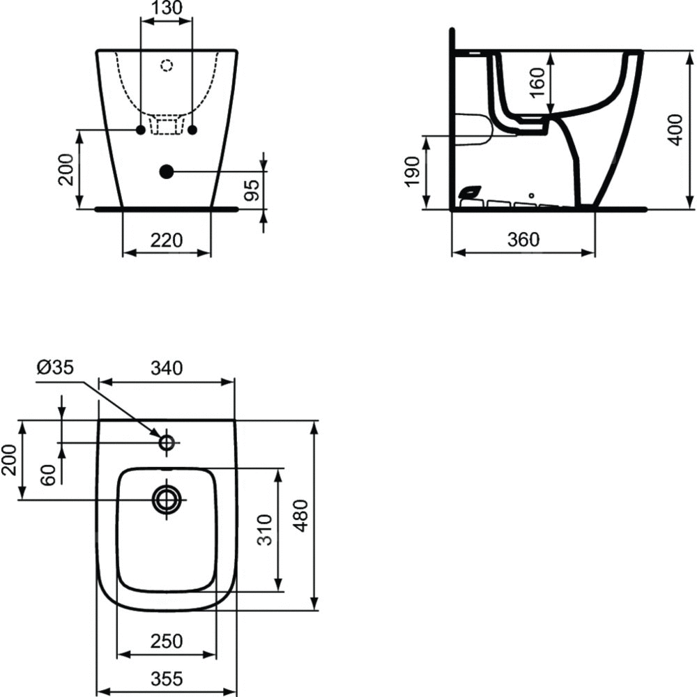 Bidet Ideal Standard i.life S stojąca, kompaktowa (krótki wysięg) - tylko 48 cm. Przylegający do ściany, z 1 otworem na baterię. Zestaw montażowy TT0257919 w komplecie.