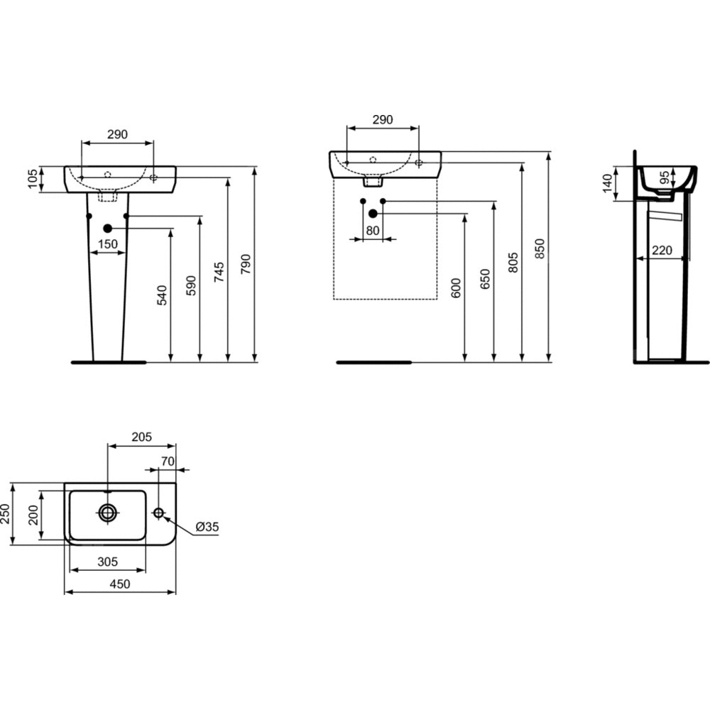 Umywalka do mycia rąk Ideal Standard i.life S 45 cm z wybitym otworem na baterię po prawej stronie oraz przelewem. Zestaw montażowy TT0299729 w komplecie. Do montażu z małym postumentem E253901 lub samodzielnie z syfonem.