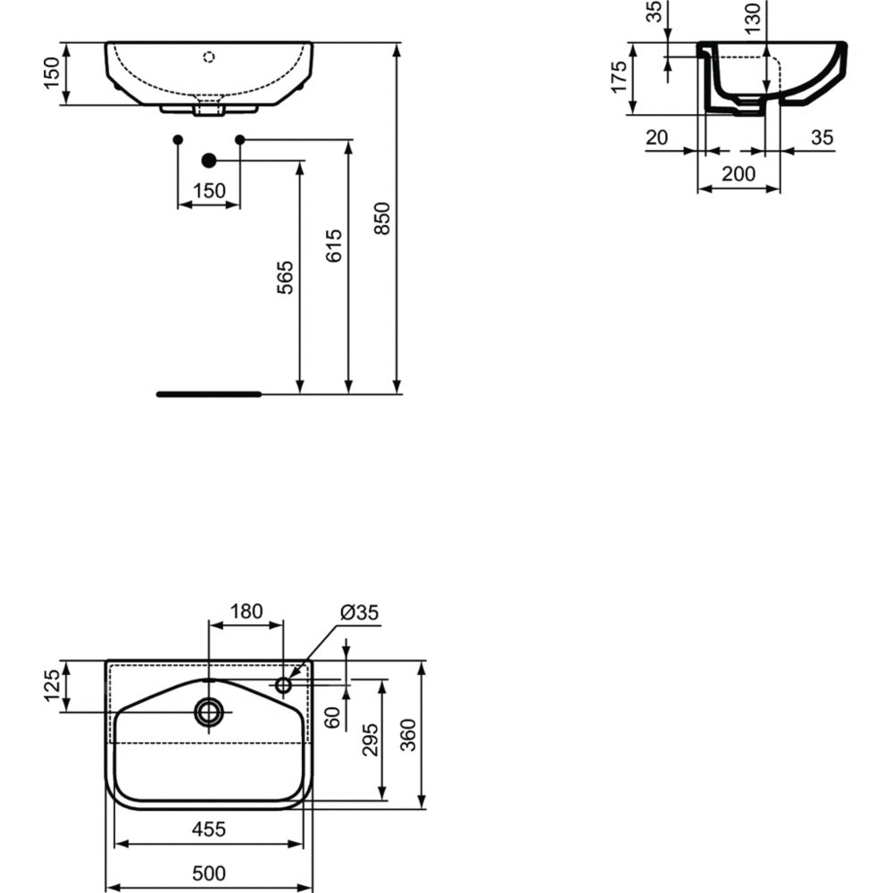 Umywalka Ideal Standard i.life S podblatowa kompaktowa (krótki wysięg) - tylko 36 cm. Z wybitym otworem na baterię po prawej stronie oraz przelewem. Zestaw montażowy oraz szablon do wycinania w komplecie.