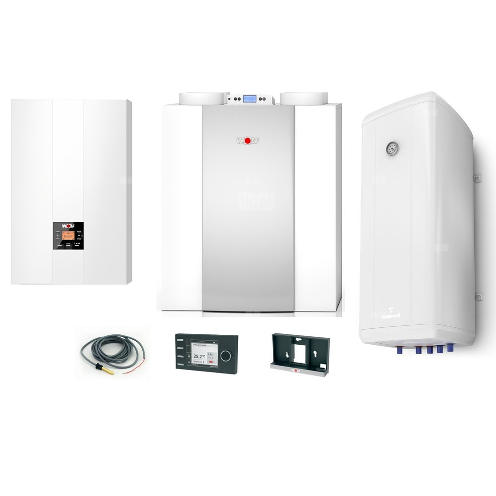 Gazowy kocioł kondensacyjny Wolf FGB 24 z rekuperatorem CWL 400L, z zasobnikiem Vulcan 120 w wersji wiszącej i czujnikiem temperatury c.w.u. oraz modułem pogodowym BM-2 i podstawą ścienną do modułu BM-2.