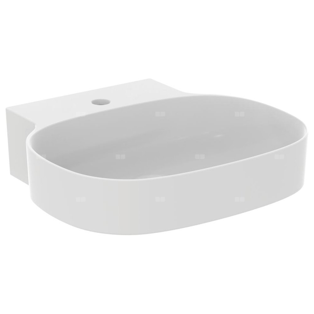 Umywalka Linda-X wisząca do montażu na meblach lub blacie (szlifowany spód). Z wybitym otworem na baterię, bez przelewu. W komplecie szablon do wycinania TT0299731.