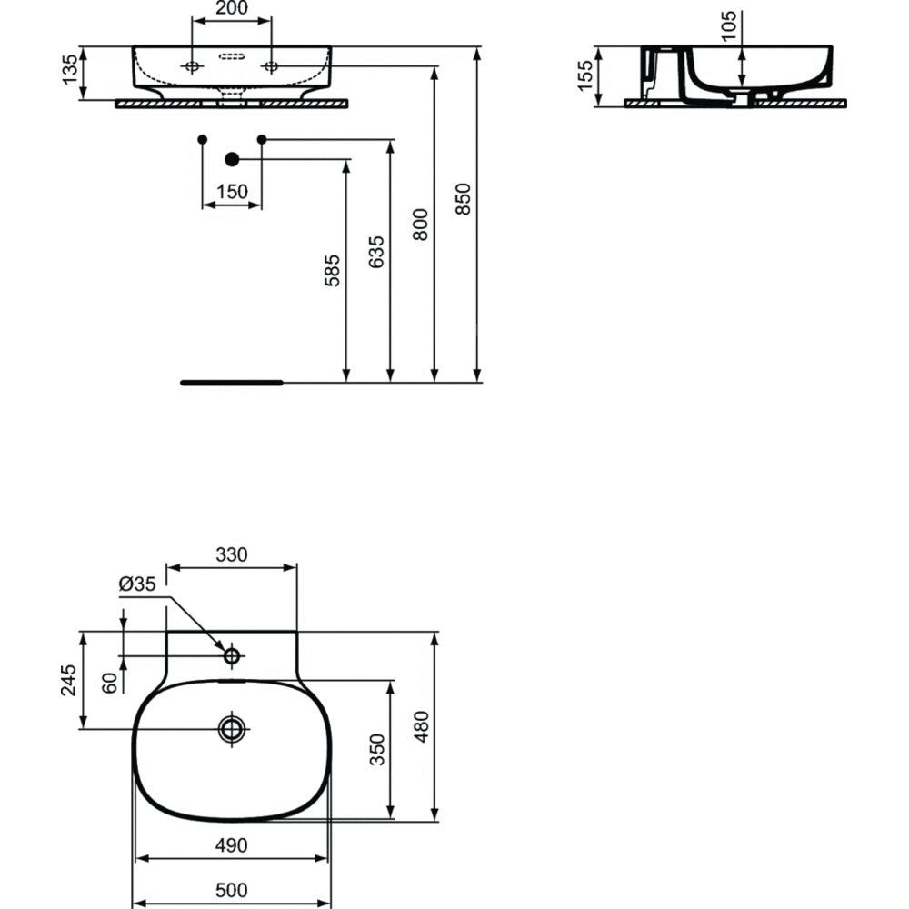 Umywalka Linda-X do montażu na meblach lub blacie (szlifowany spód). Z wybitym otworem na baterię, z przelewem. W komplecie szablon do wycinania TT0299731.