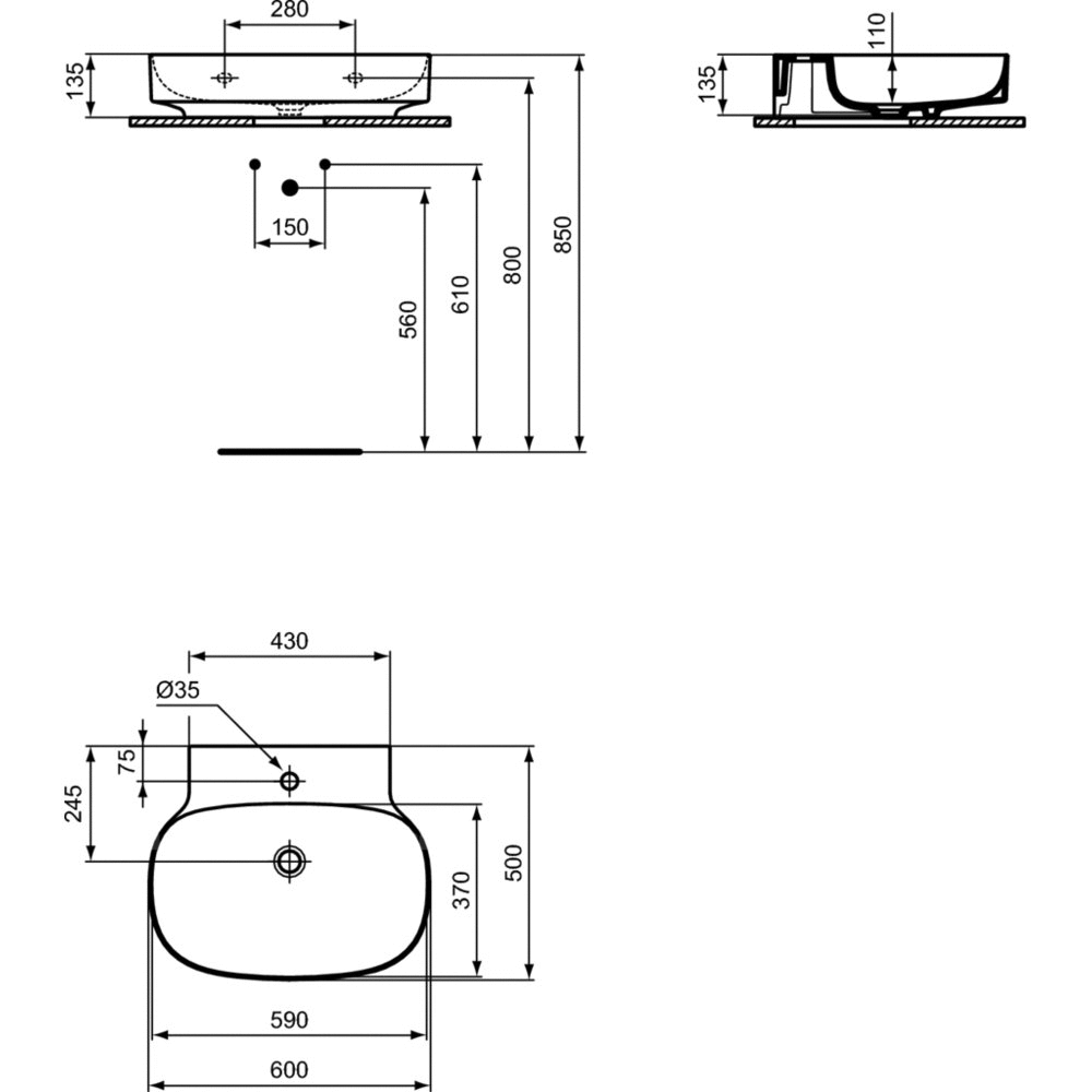 Umywalka Linda-X wisząca, nieszlifowana od spodu, do samodzielnego montażu. Z wybitym otworem na baterię, bez przelewu. Niezbędny montaż z ukryty system przelewowy IdealFlow N8326AA lub syfon typu free flow E2114xx - w osobnym zamówieniu.