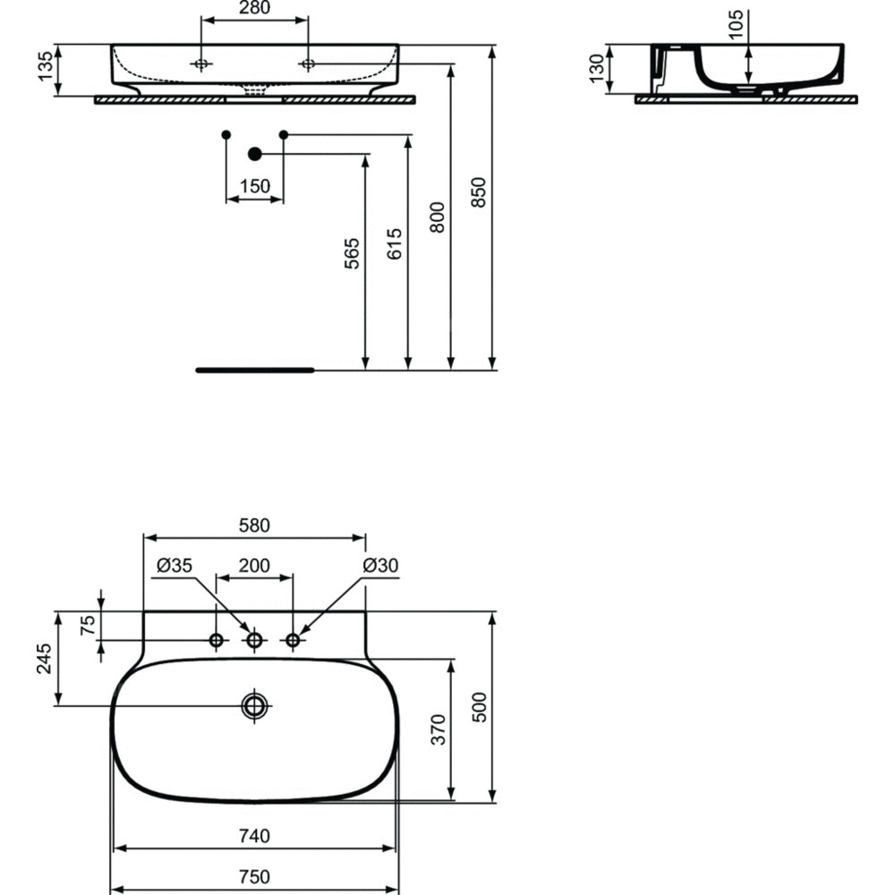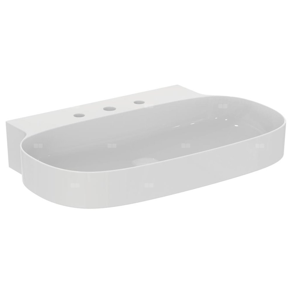 Umywalka Linda-X wisząca do montażu na meblach lub blacie (szlifowany spód). Z 3 wybitymi otworami na baterię, bez przelewu. W komplecie szablon do wycinania TT0299731.