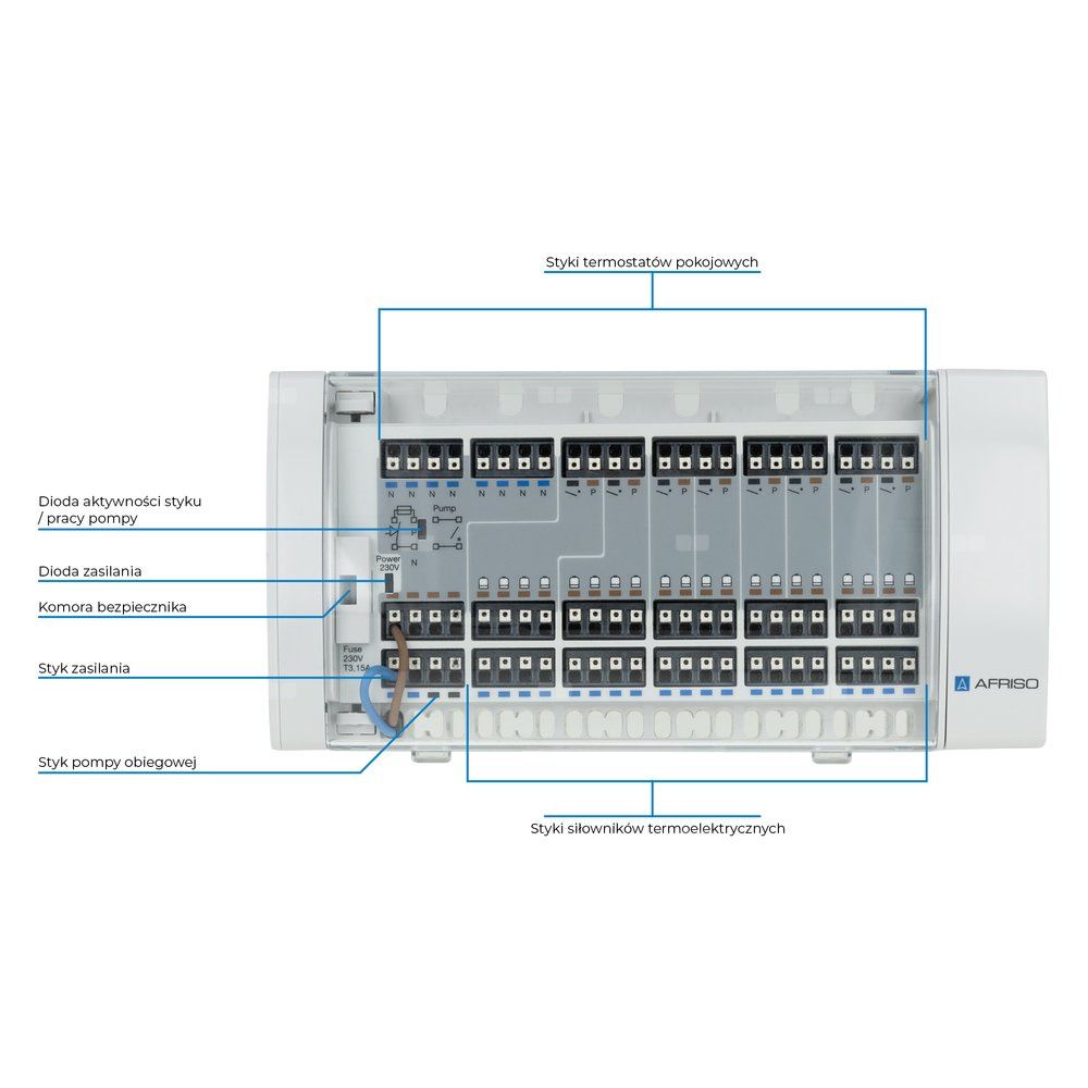 - Obsługuje do 20 siłowników termoelektrycznych (2 strefy po 4 siłowniki, 6 stref po 2 siłowniki).