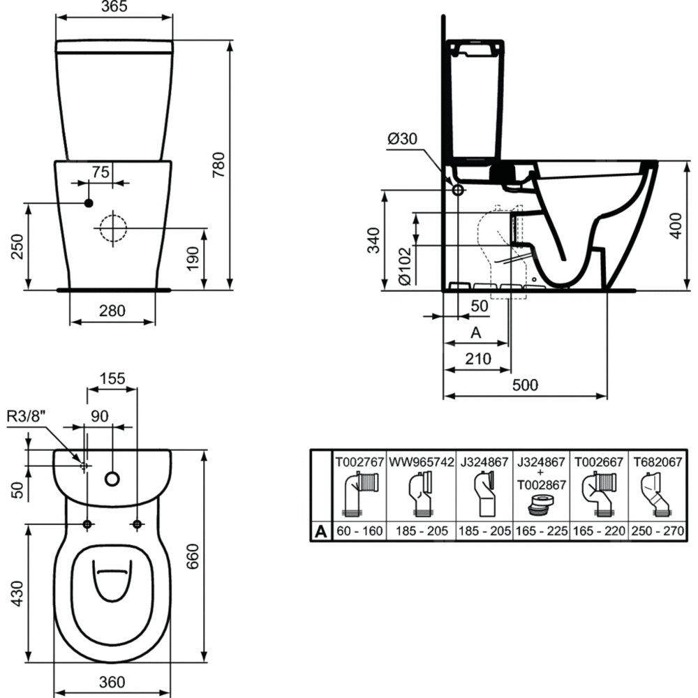 Miska przylegająca do ściany 365x665x400 mm, umywalka w białym wykończeniu, odpływ poziomy, idealPlus - CONNECT