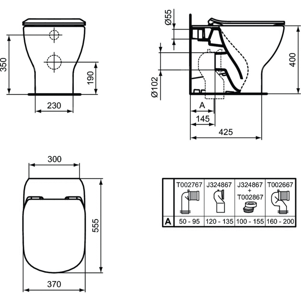 Lejowa. Przylegająca do ściany. Poziomy odpływ (uniwersalny). Zestaw montażowy TT0257919 w komplecie. w kartonowym opakowaniu. PL-EN 997. Opcjonalnie: Kolano przyłączeniowe 90° (w przypadku pionowego montażu). UWAGA: Nie zaleca się instalacji WC AquaBlade® z pneumatycznym zaworem spłukującym!. Niezbędne wyposażenie: - Deska sedesowa typu THIN z pokrywą, metalowe zawiasy, duroplast (T352801). Deska sedesowa typu THIN z pokrywą, wolnoopadająca z zawiasami ułatwiającymi demontaż, duroplast (T352701). Zalecane wyposażenie: - Kolano przyłączeniowe 90° (pionowe), odległość 120-150 mm distance (od ściany do środka odpływu) (J324867). Kolano przyłączeniowe 90° (pionowe), odległość 160-200 mm distance (od ściany do środka odpływu) (T002667). Kolano przyłączeniowe 90° (pionowe), odległość 50-110 mm distance (od ściany do środka odpływu) (T002767). Element montażowy do skompletowania z kolanem przyłączeniowym 90° J324867 - do zastosowania przy odległości 100-170 mm (od ściany do środka odpływu) (T002867). Ogranicznik otworu (w przypadku, gdy nominalna objętość pełnego spłukiwania jest większa niż 6l do 9l) (WW965956).