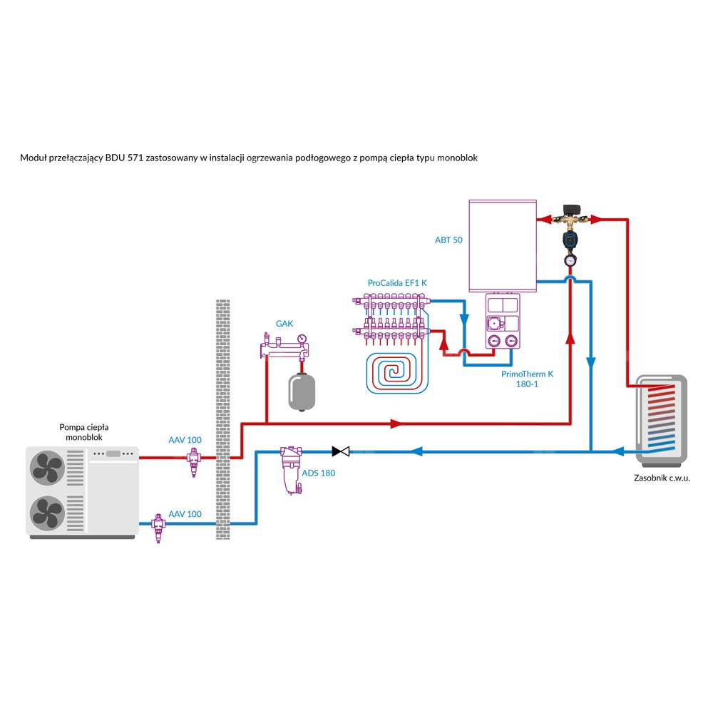 Wyposażony w 3-drogowy zawór strefowy AZV 643 oraz pompę obiegową APH 160.