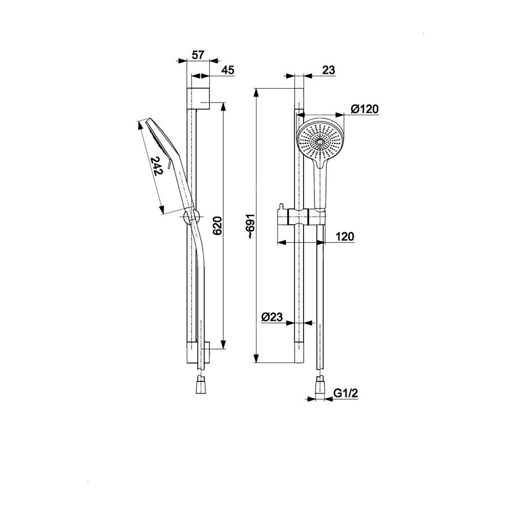 Opakowanie zawiera: drążek natrysku, uchwyty ścienne ‒ 2 szt. (w tym 1 uchwyt z możliwością dostosowania położenia do starych otworów), zestaw montażowy (2 wkręty z kołkami ściennymi), rączka natrysku z uchwytem, wąż PVC (L=1500 mm)