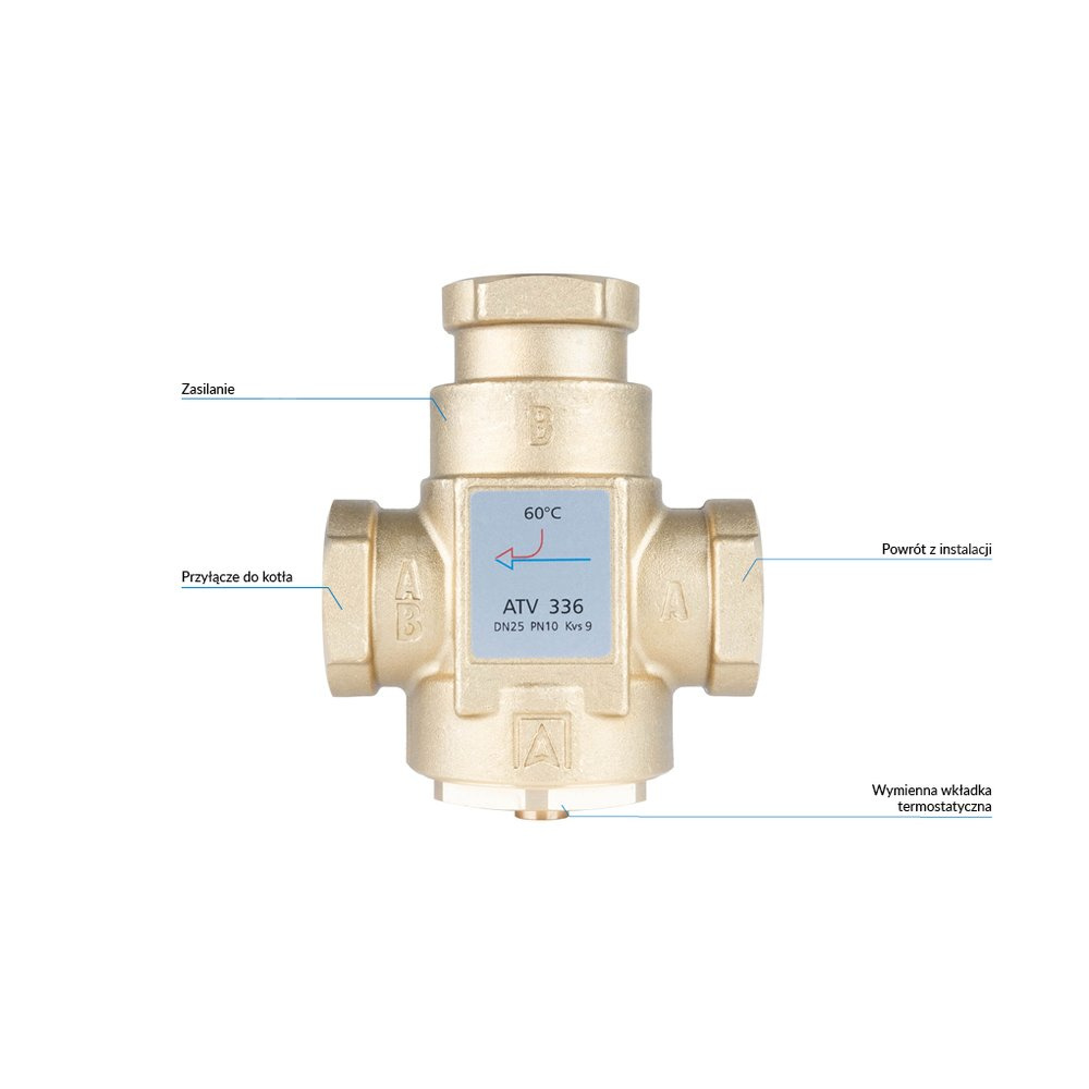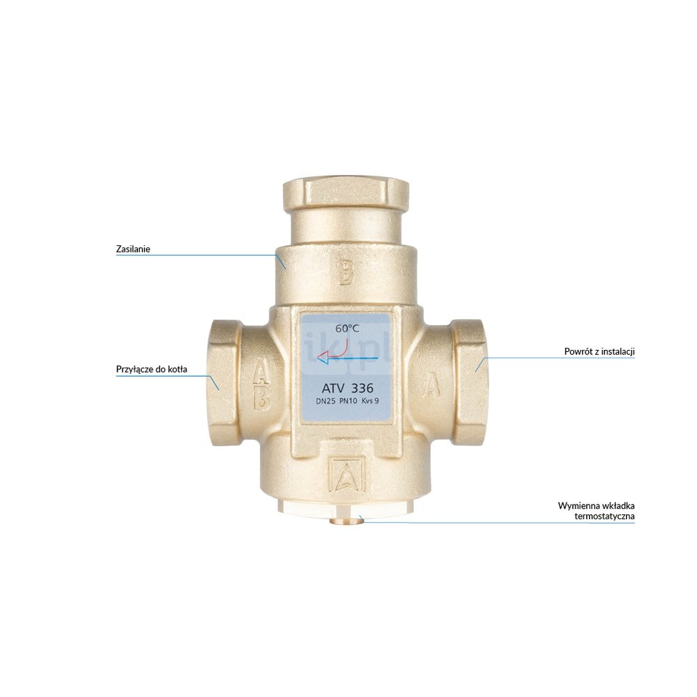 - Wymienny element termostatyczny umieszczony w zaworze ustawiony fabrycznie na stałą temperaturę 60°C.