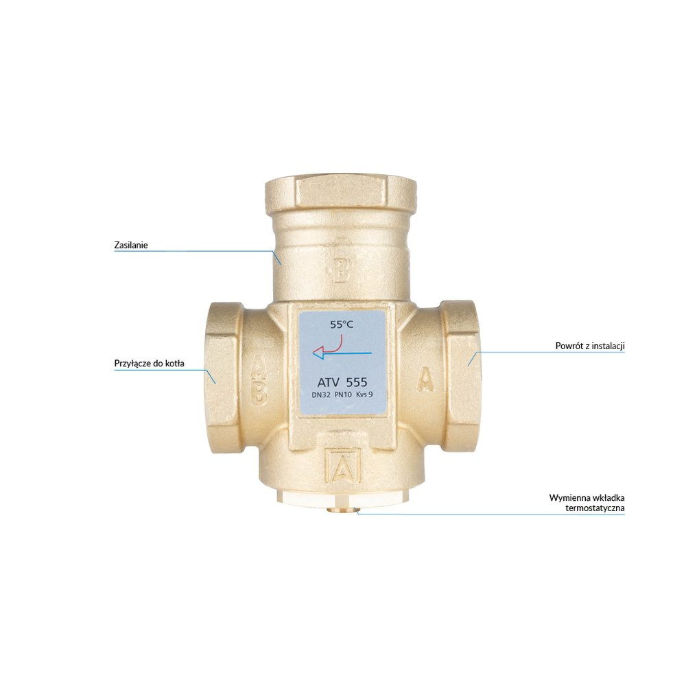- Wymienny element termostatyczny umieszczony w zaworze ustawiony fabrycznie na stałą temperaturę 55°C.