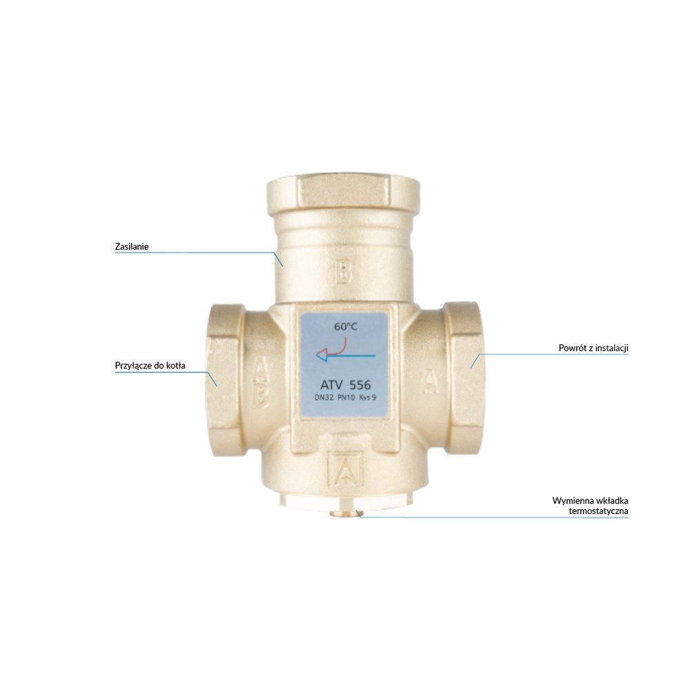 - Wymienny element termostatyczny umieszczony w zaworze ustawiony fabrycznie na stałą temperaturę 60°C.