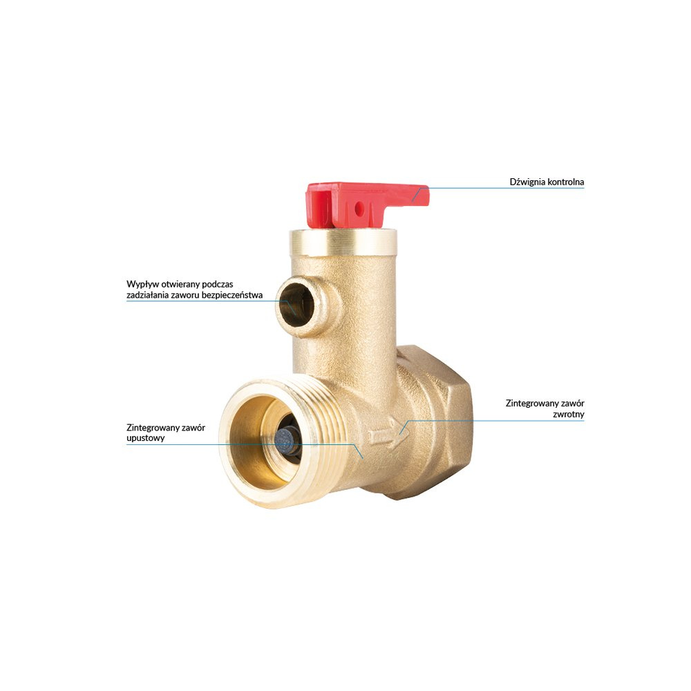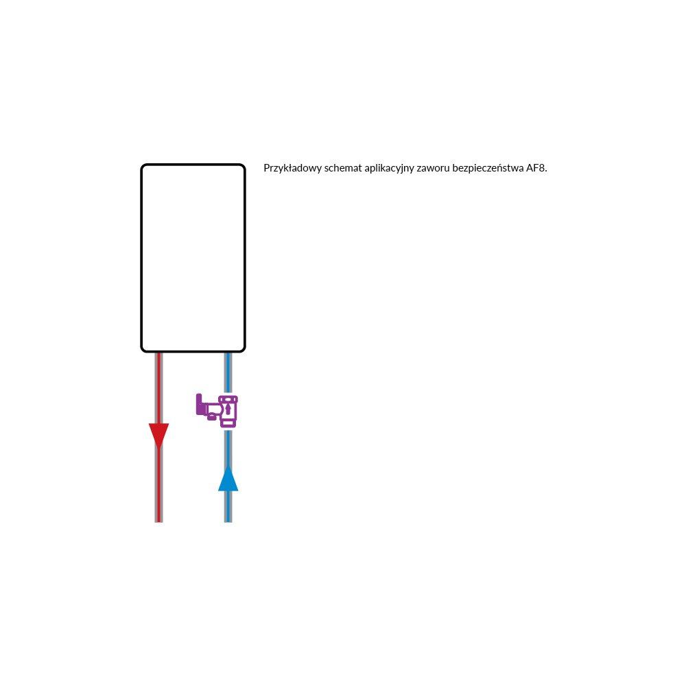 AF8 - zawór bezpieczeństwa z zaworem zwrotnym do elektrycznych podgrzewaczy c. w. u. Zawiera: zawór bezpieczeństwa, zawór zwrotny i zawór upustowy umożliwiający obniżenie ciśnienia w zasobniku.