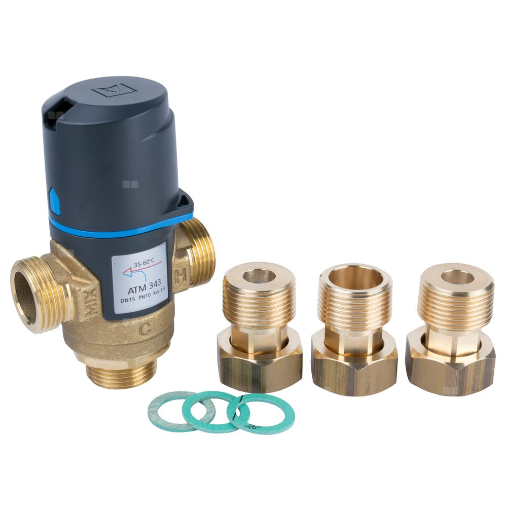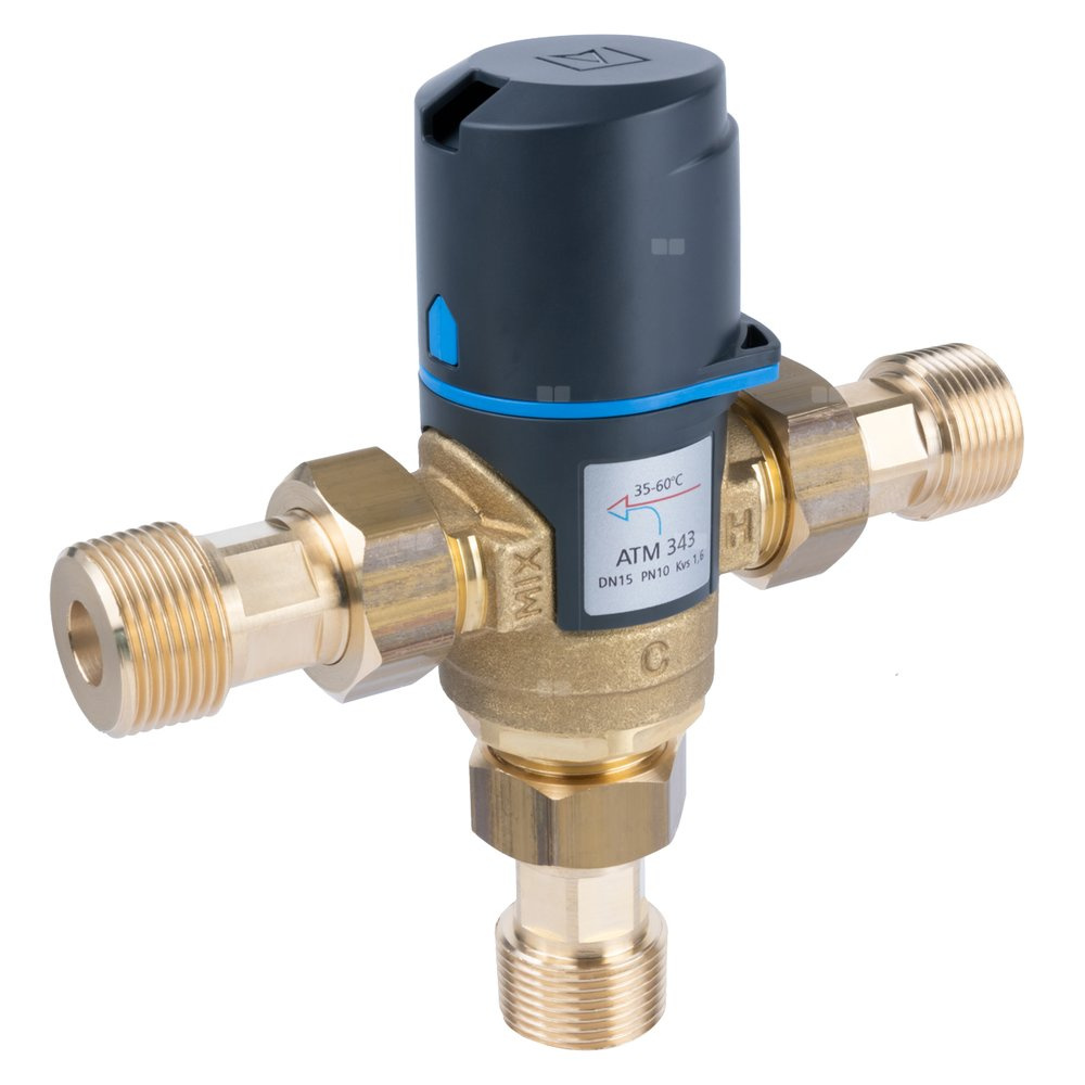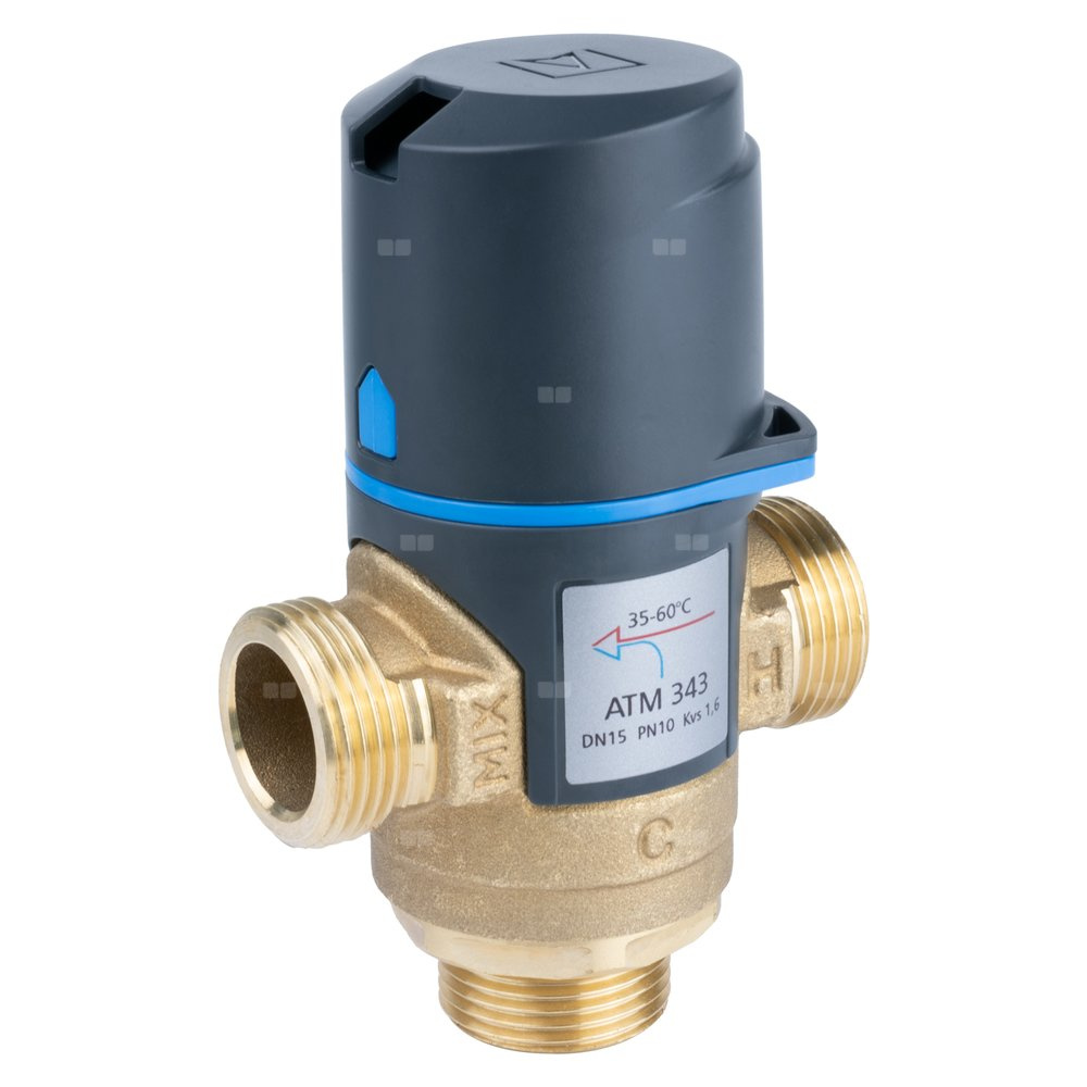 Zawór regulacyjny termostatyczny do wody ciepłej AFRISO ATM 343 ze śrubunkami mosiądz GZ 3/4'', DN 15, zakres temp. 35-60'C, Kvs 1.6 m3/h, maksymalna temperatura 90'C, maksymane ciśnienie 10 bar