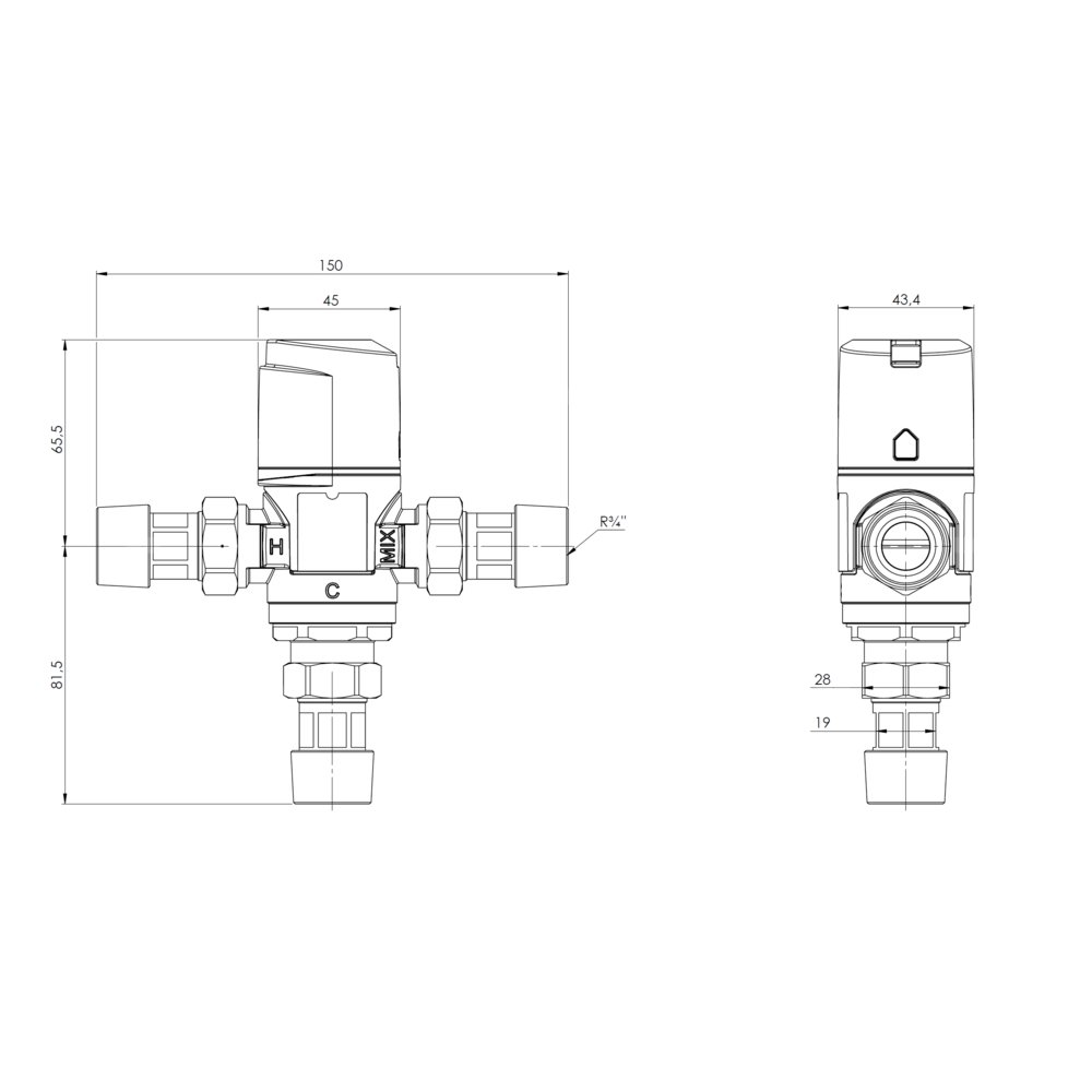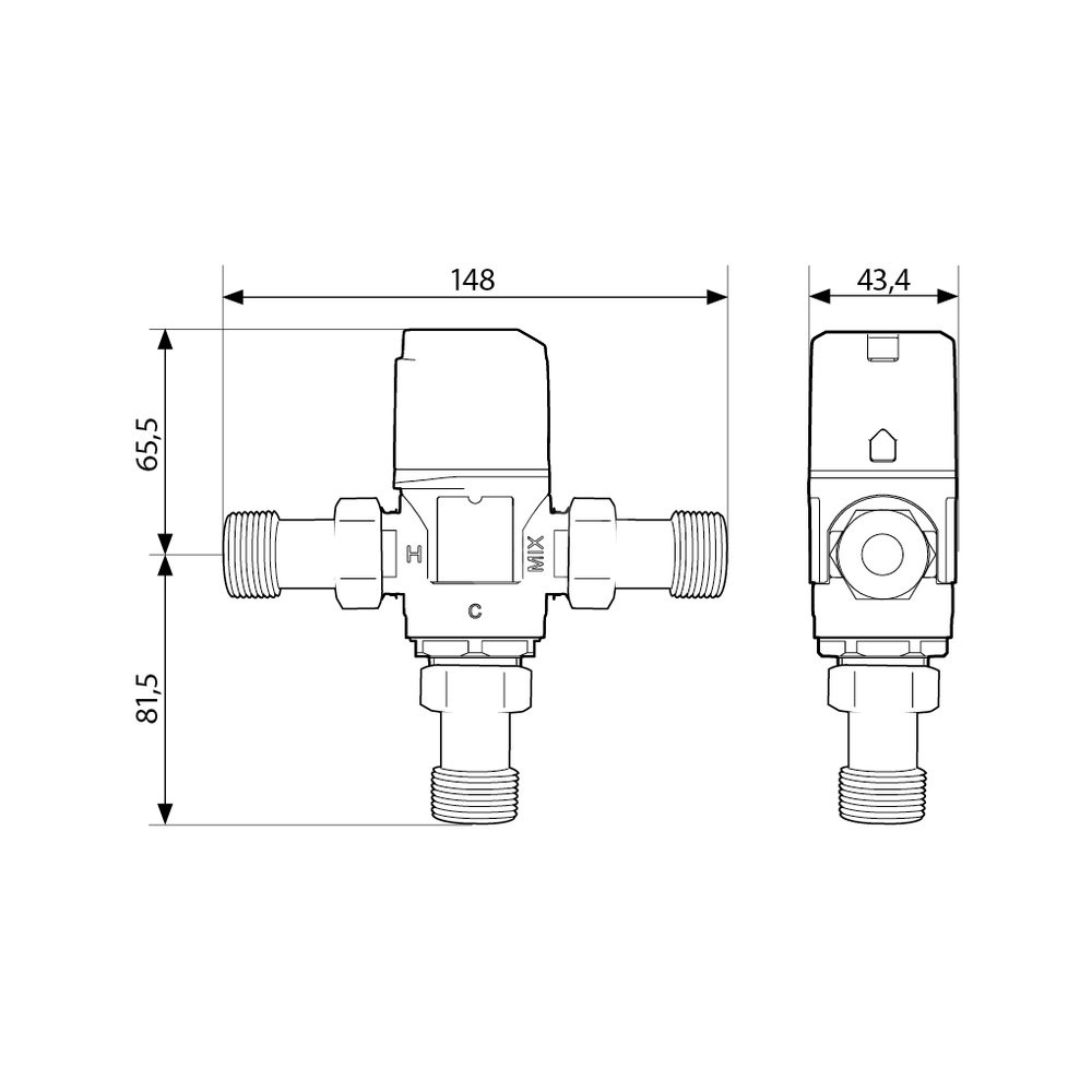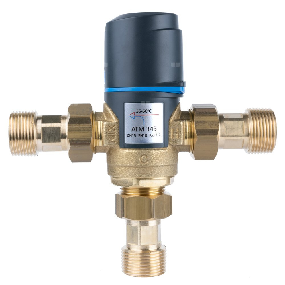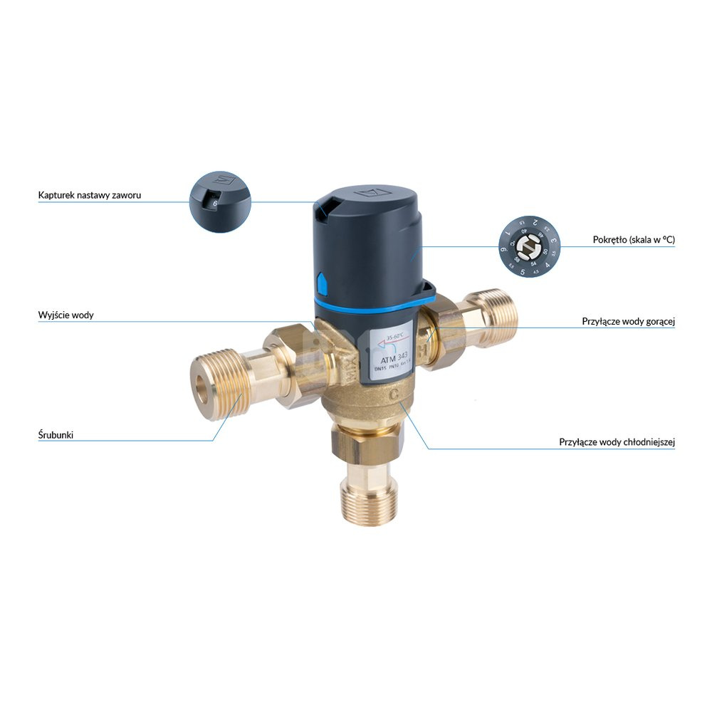 Zawór regulacyjny termostatyczny do wody ciepłej AFRISO ATM 343 ze śrubunkami mosiądz GZ 3/4'', DN 15, zakres temp. 35-60'C, Kvs 1.6 m3/h, maksymalna temperatura 90'C, maksymane ciśnienie 10 bar