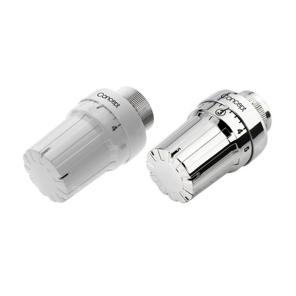 Głowica termostatyczna z przyłączem gwintowanym M30 x 1,5, z zabezpieczeniem przed zamarzaniem i ukrytą blokadą nastawy. Zakres regulacji temperatury 8-28°C. Dostępna w kolorach: biały i chrom.
