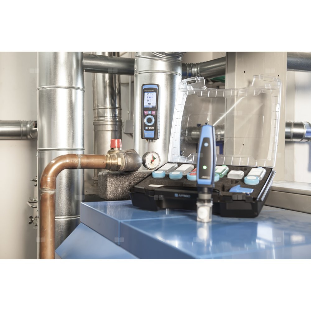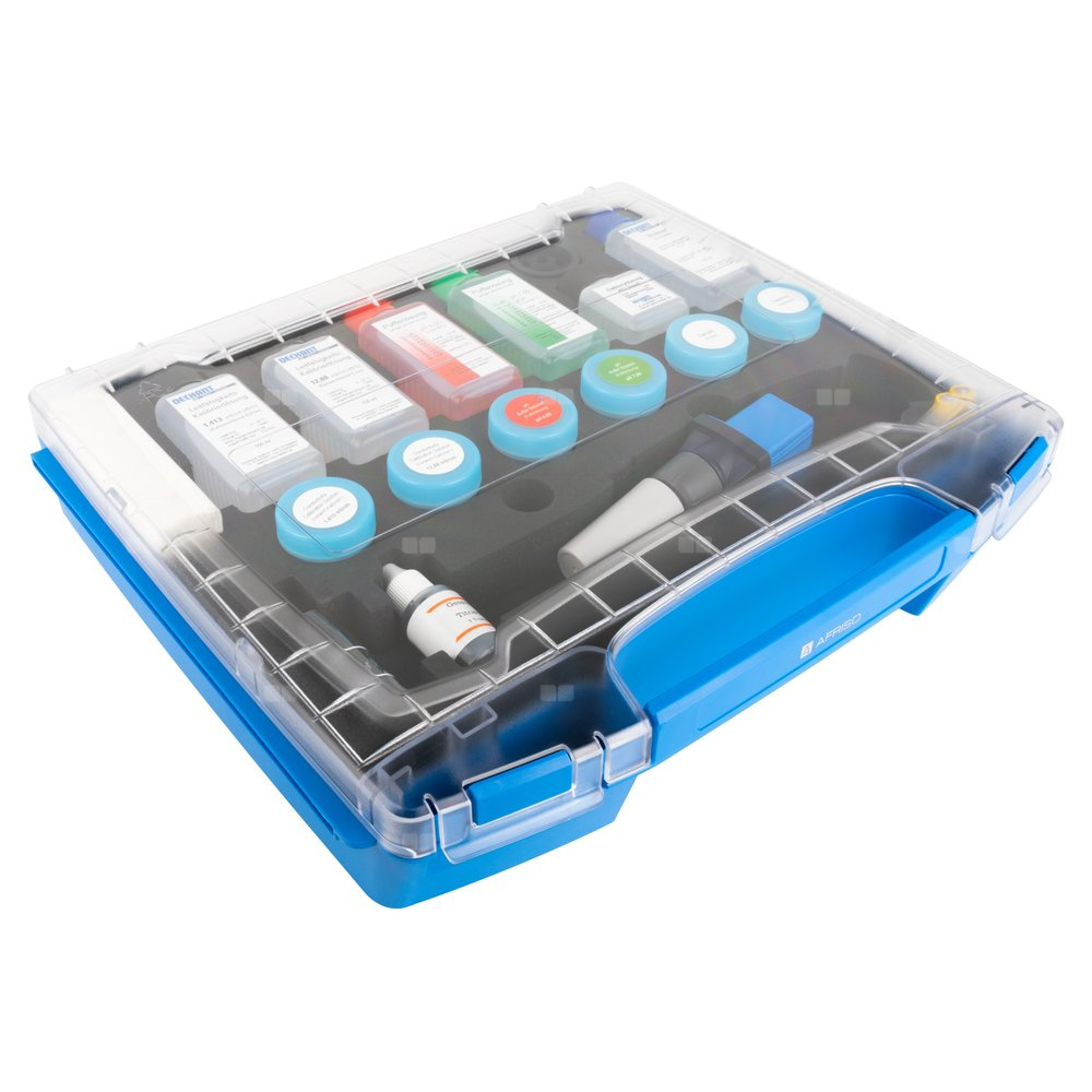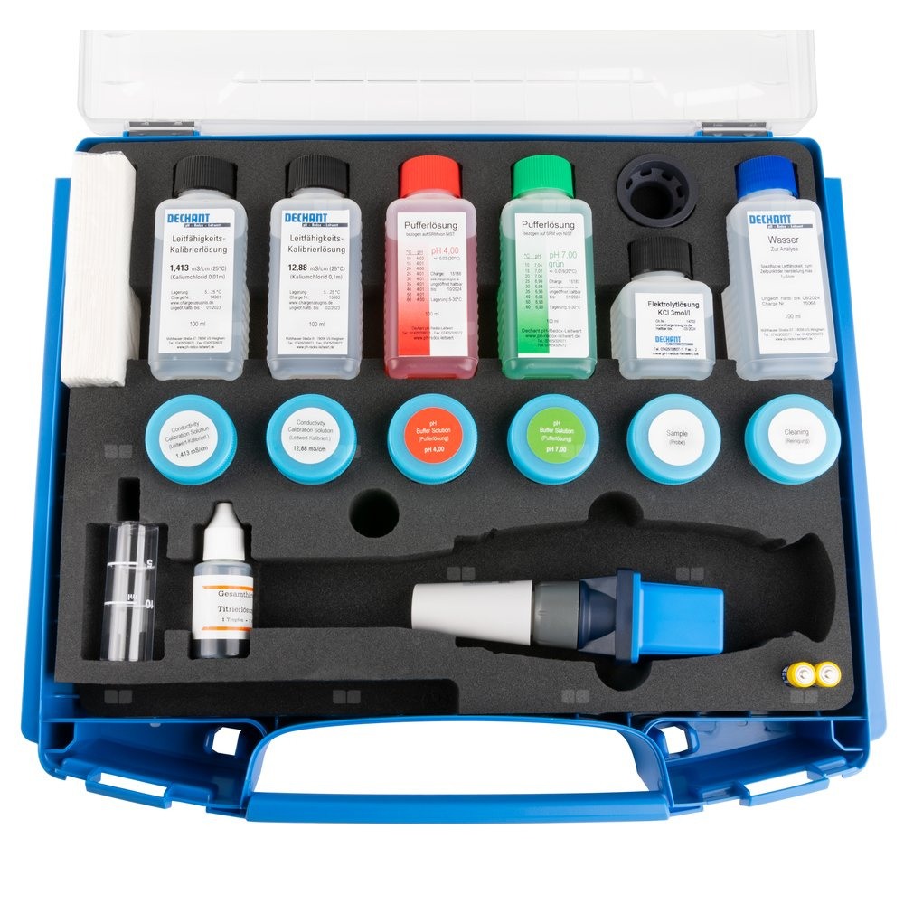OPIS:Wymienna głowica CAPBs®, sens WQ10 wraz z pełnym zestawem służącym do pomiaru jakości wody.ZASTOSOWANIE:Określanie jakości wody przy użyciu parametrów mierzonych: pH, przewodność elektryczna, temperatura oraz obliczanych: stopień twardości, zasolenie, TDS,Zapobieganie uszkodzeniom w instalacjach wodnych ogrzewania spowodowanych korozją po stronie wody,Odczyty zasolenia dla branż takich jak: rolnictwo, hydroponika czy monitorowanie basenów oraz spa.ELEMENTY DOSTAWY:Wymienna głowica CAPBs®, sens WQ10,Nasadka ochronna dla głowicy pomiarowej,Roztwory kalibracyjne,Roztwór ochronny dla głowicy pomiarowej,Wodę destylowaną do czyszczenia,Pojemniczki na próbkę pomiarową oraz do kalibracji,Nakładkę stabilizującą urządzenie w trakcie pomiaru,Chusteczki do czyszczenia głowicy pomiarowej,2x bateria alkaliczna 1,5V typu AAA,Walizka transportowa.ZAKRES POMIAROWY: Przewodność elektryczna - 0 ÷, 50 000 µ,S/cmZasolenie - 0 ÷, 25 000 ppmTDS - 0 ÷, 50 000 mg/lpH - 0 ÷, 14 pHTemperatura - -5,0 ÷, 60,0°,CROZDZIELCZOŚĆ POMIAROWA:Przewodność elektryczna - 1 µ,S/cm, 0,1 mS/cmZasolenie - 0,1 ppm, 0,01 pptTDS - 1 mg/l, 0,01 g/lpH - 0,01 pHTemperatura - 0,1°,CDOKŁADNOŚĆ POMIAROWA:Przewodność elektryczna±,2 µ,S/cm (do 199 µ,S/cm)±,5 µ,S/cm (200 do 499 µ,S/cm)±,20 µ,S/cm (500 do 1999 µ,S/cm)±,0,2 mS/cm (2,0 do 19,99 mS/cm)±,0,5 mS/cm (20,00 do 50,00 mS/cm)pH ±,0,01 pHTemperatura ±,0,5°,C