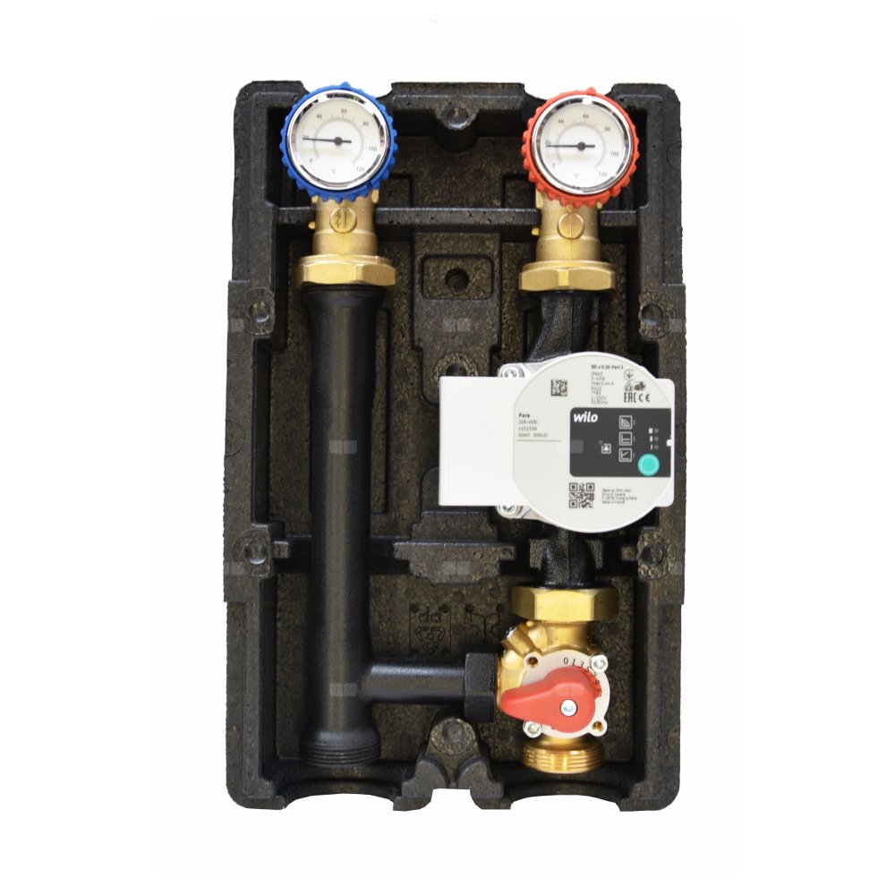 Kompaktowa grupa mieszająco-pompowa GP-T wyposażona jest w mosiężny, trzydrogowy zawór mieszający GZM-T, dwa mosiężne zawory kulowe z termometrami wody zasilającej i powrotnej (z wbudowanym zaworem zwrotnym), łącznik stalowy i izolację. Na życzenie grupa może być wyposażona w pompę firmy Grundfos lub Wilo. Dodatkowo aby zapewnić automatyczną pracę zaworu mieszającego należy grupę wyposażyć w siłownik GS - 10Nm.