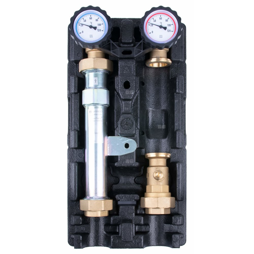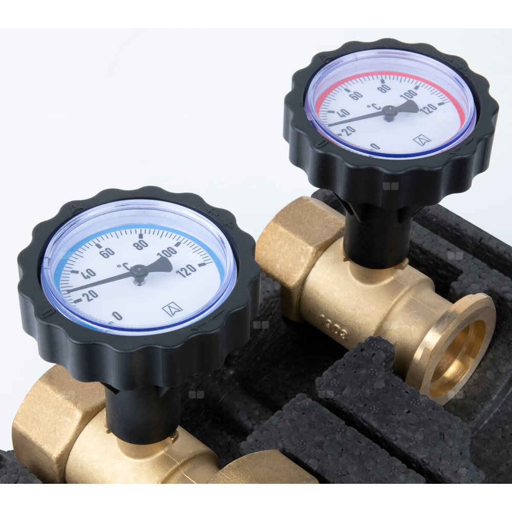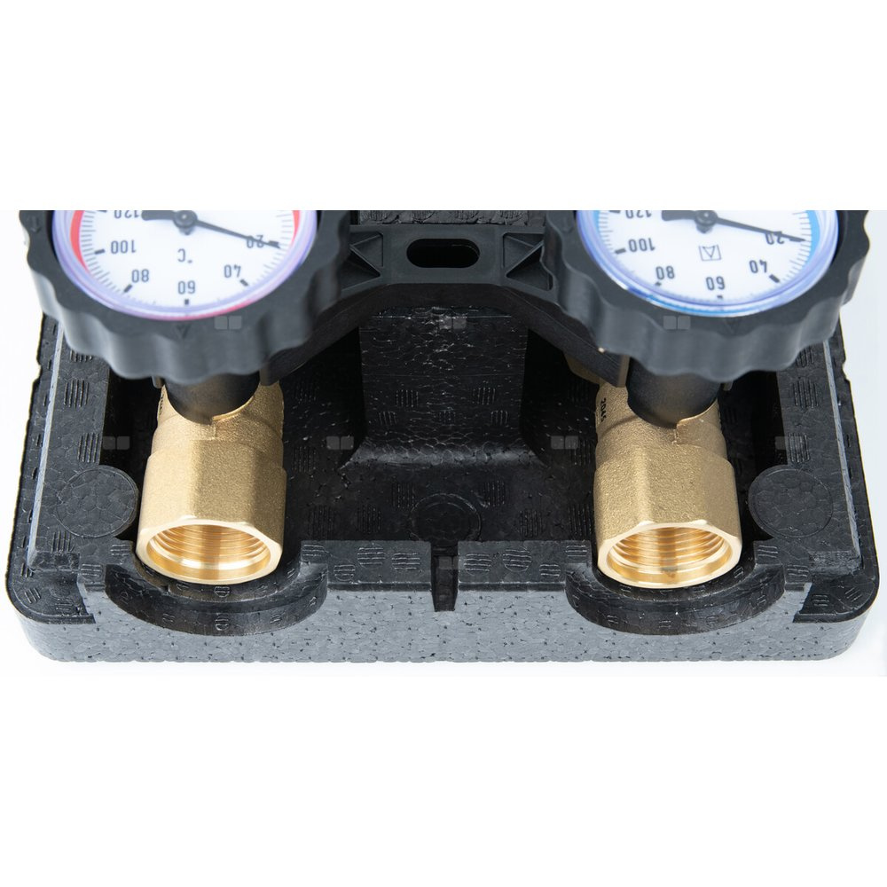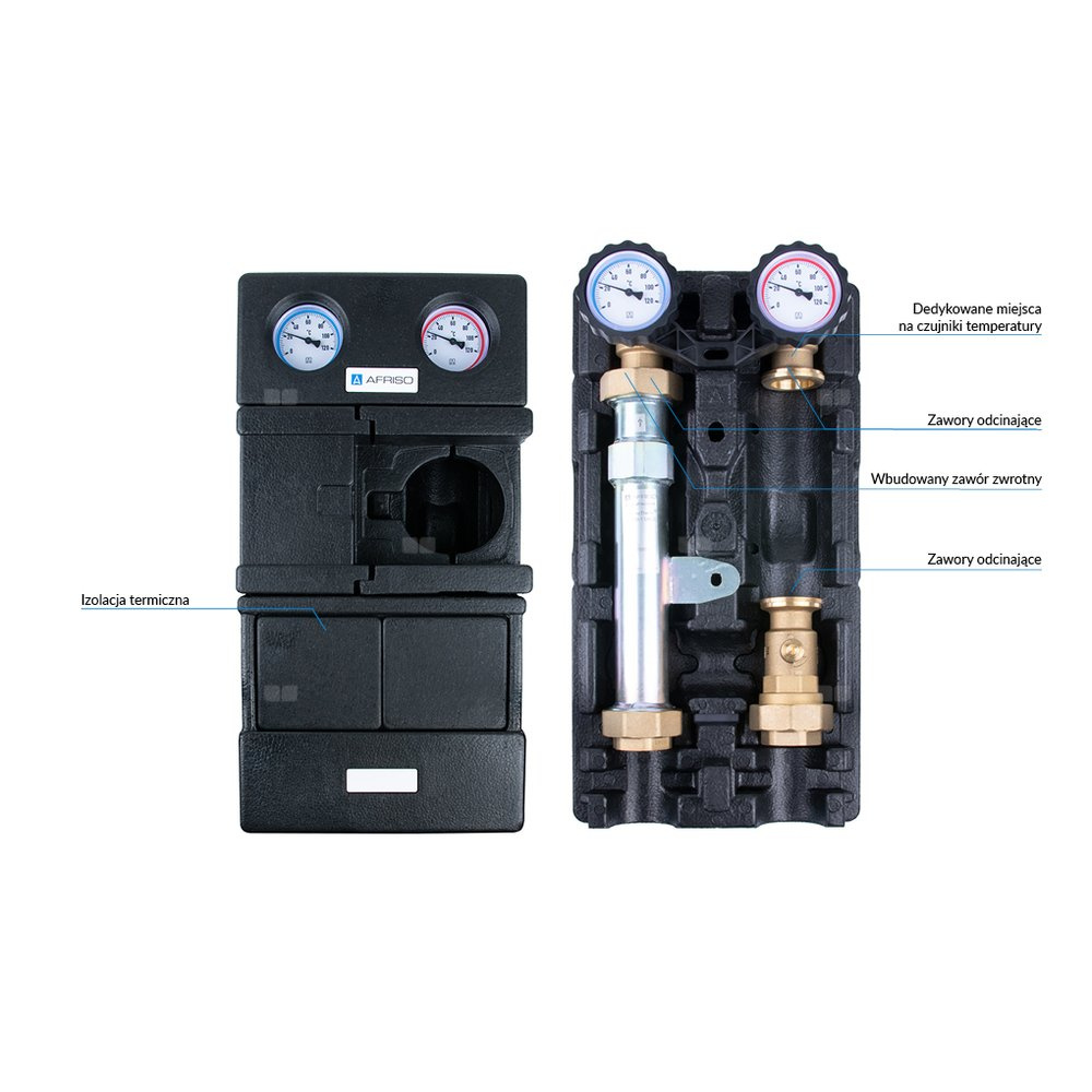- Wyposażona w niezbędne komponenty: termometry do pomiaru temperatury zasilania i powrotu, zawór zwrotny, zawory odcinające na zasilaniu i powrocie, zawór odcinający przed pompą, izolacja termiczna.