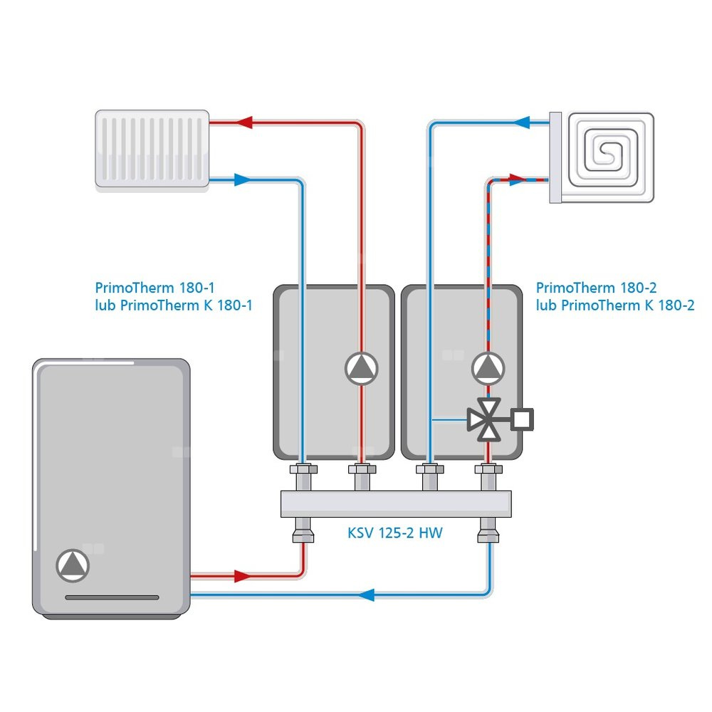 Grupa pompowa AFRISO PrimoTherm K 180-2 DN 25 WP 3-WM-SM GZ x GW 1 1/2'' x 1'', z zaworem mieszającym, z izolacją, z pompą obiegową Wilo Para SC 25/6, z siłownikiem arm 343 proclick