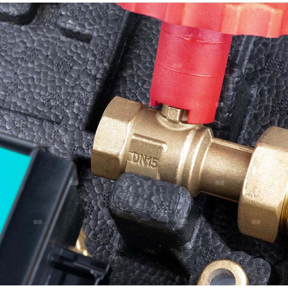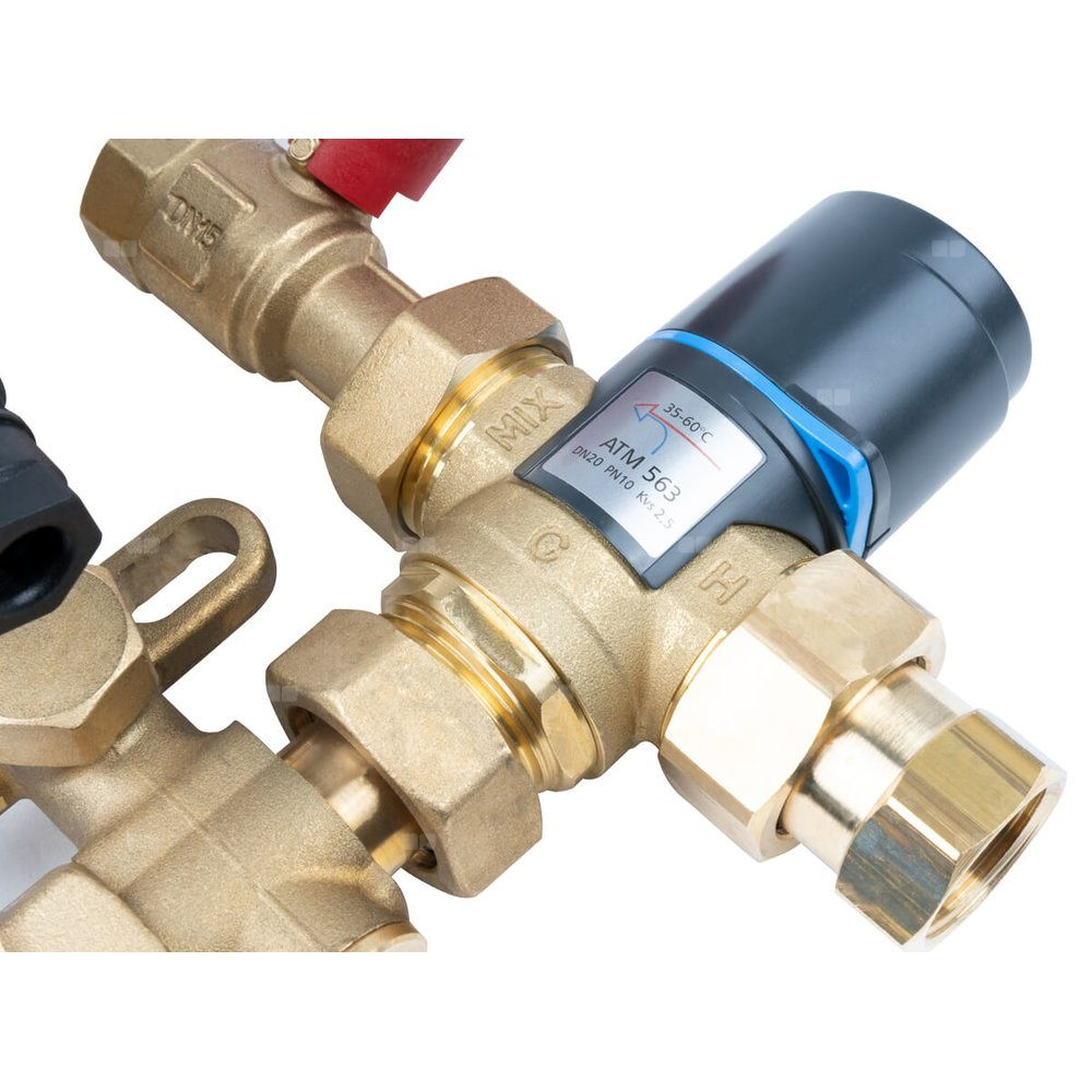 Niezbędna armatura: zawór termostatyczny ATM, termometr z wbudowanym zaworem odcinającym, cztery wbudowane zawory zwrotne, dwa zawory odcinające, zawór upustowo-odpowietrzający, zawór bezpieczeństwa 6 bar.