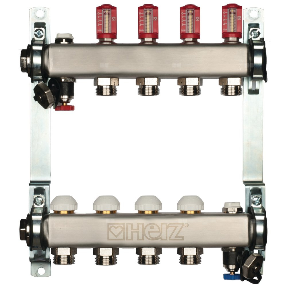 Rozdzielacz do ogrzewania podłogowego HERZ 10-obieg. stal nierdzewna GW 1'' x GZ 3/4'' + przepływomierz + zawór napełn/spust + odpowietrznik