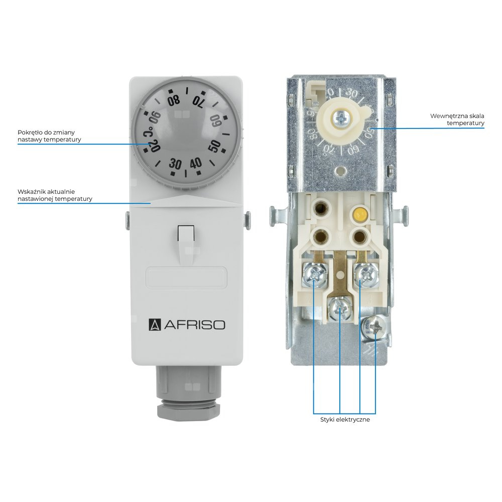 Przeznaczony do sterowania urządzeniami zewnętrznymi, na zasadzie włącz/wyłącz.Włącza lub wyłącza sterowane urządzenie w zależności od temperatury zmierzonej na powierzchni kontaktu i nastawionej na pokrętle.