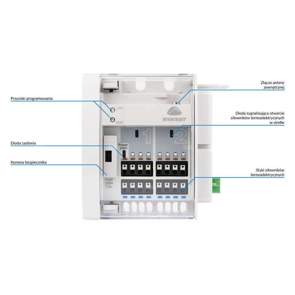 Pozwala sparować do 2 termostatów bezprzewodowych R FT / R FTF i podłączyć do 8 siłowników termoelektrycznych (np. TSA 01).