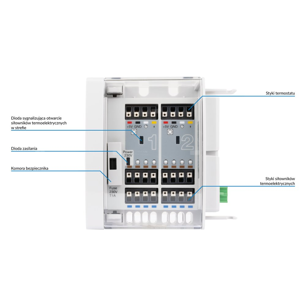 Steruje temperaturą w pomieszczeniach / strefach przez siłowniki termoelektryczne na podstawie sygnałów z termostatów tam umieszczonych.