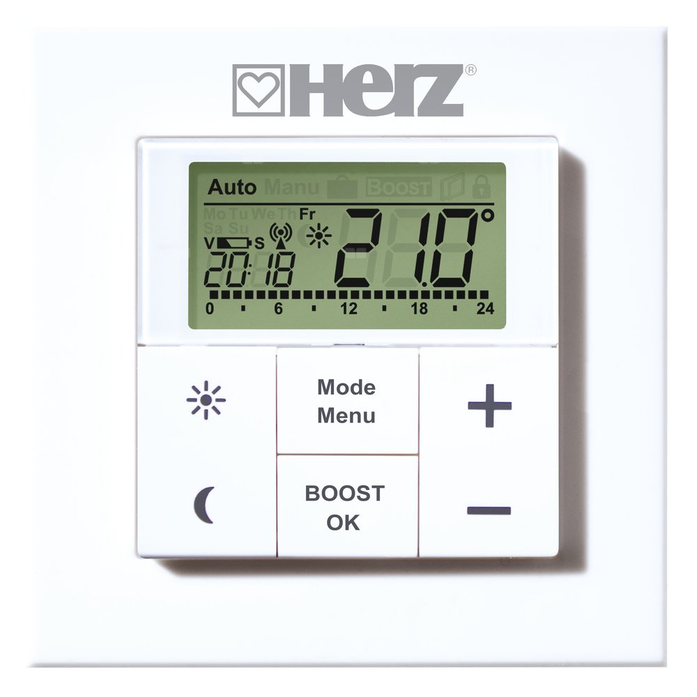Termostat ścienny - radiowy. Do sterowania elektronicznych głowic termostatycznych (1 8251 01) maks. 8 szt., bez połączenia przewodowego, do optymalnego dopasowania temperatury pokojowej. Zintegrowane czujniki pomiarowe temperatury wewnętrznej i wilgotności powietrza pozwalają dokładnie (do 0,5 °C) wyregulować temperaturę. Dowolny wybór programu dziennego lub tygodniowego, 7 programowalnych zmian temperatury na dzień. Dwuwierszowy wyświetlacz z czytelnymi znakami. Baterie: 2 x LR 6. Żywotność baterii: ok. 2 lata. Zasięg sygnału: 100 m.