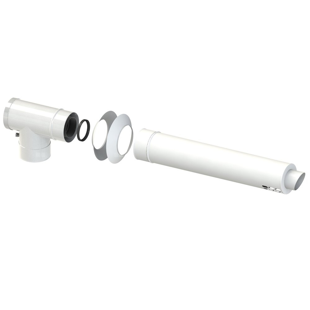 Pakiet elementów powietrzno-spalinowych Concept, umożliwia odprowadzenie spalin z kotłów kondensacyjnych lub turbo, bezpośrednio przez zewnętrzną ścianę budynku. Kanałem powietrznym, jaki tworzą między sobą rura spalinowa i osłonowa jest dostarczane świeże powietrze do komory spalania urządzenia grzewczego. Szczelność części spalinowej w zakresie nadciśnienia do 200 Pa i temperatury do 120°C gwarantuje połączenie kielichowe z wewnętrzną uszczelką. Zestaw zawiera: trójnik 87° - rewizyjny z króćcami pomiarowymi, Rozetę (2 szt.), rurę 750 mm z zakończeniem poziomym, uszczelkę silikonową (wewnętrzną).