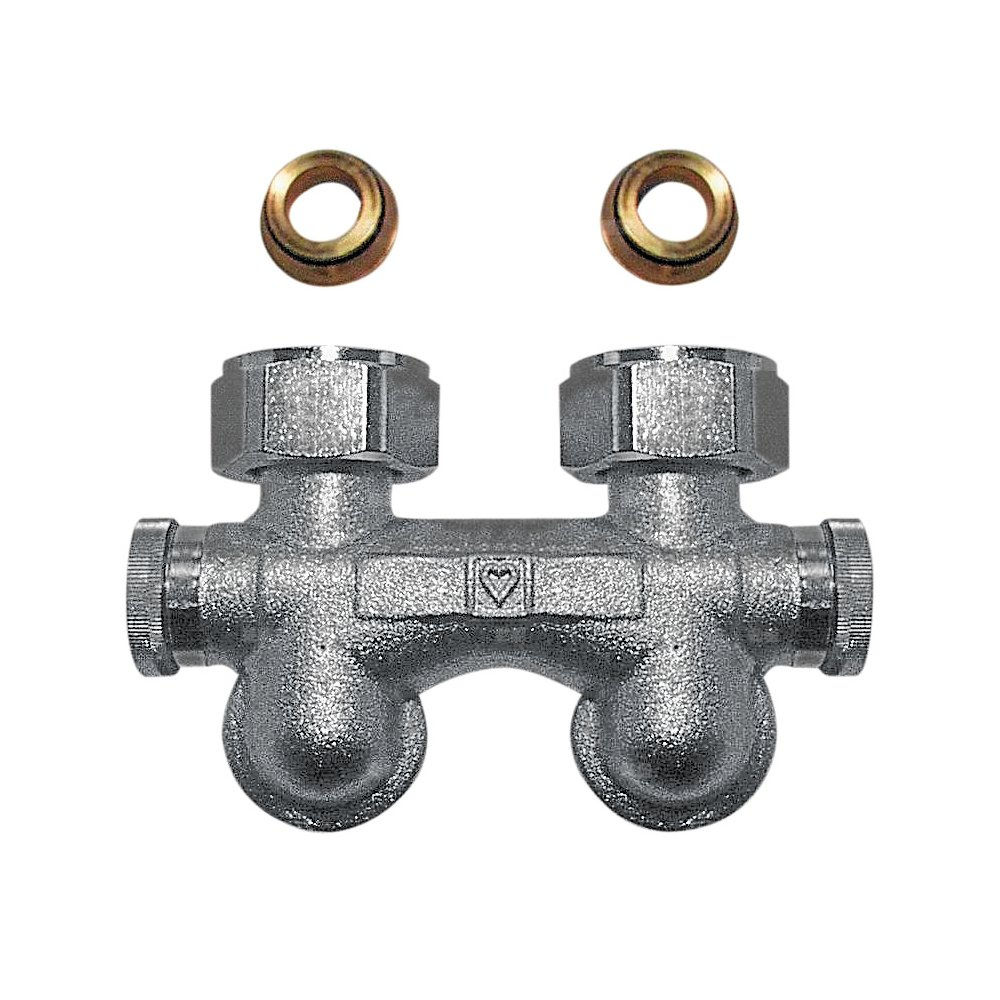 Korpus obejścia HERZ-3000 ze stałym obejściem, figura kątowa. Rozstaw króćców przyłączeniowych 50 mm, przyłącze grzejnikowe G 3/4 ze stożkiem, swobodne nakrętki. Przyłącze do rur z gwintem zewnętrznym G 3/4 ze stożkiem do złączy zaciskowych. Złącza zaciskowe oddzielnie do zamówienia