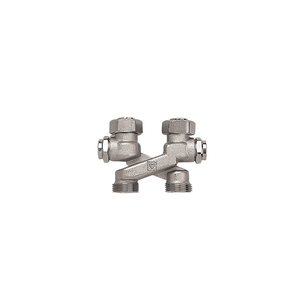 Przyłącze krzyżakowe "X" do rozstawu rur 50 mm, z funkcją odcięcia, napełniania i spustu. Przyłącze G 3/4 ze stożkiem, swobodne nakrętki. Przyłącze do rur z gwintem zewnętrznym G 3/4 ze stożkiem do złączy zaciskowych. Złącza zaciskowe oddzielnie do zamówienia.