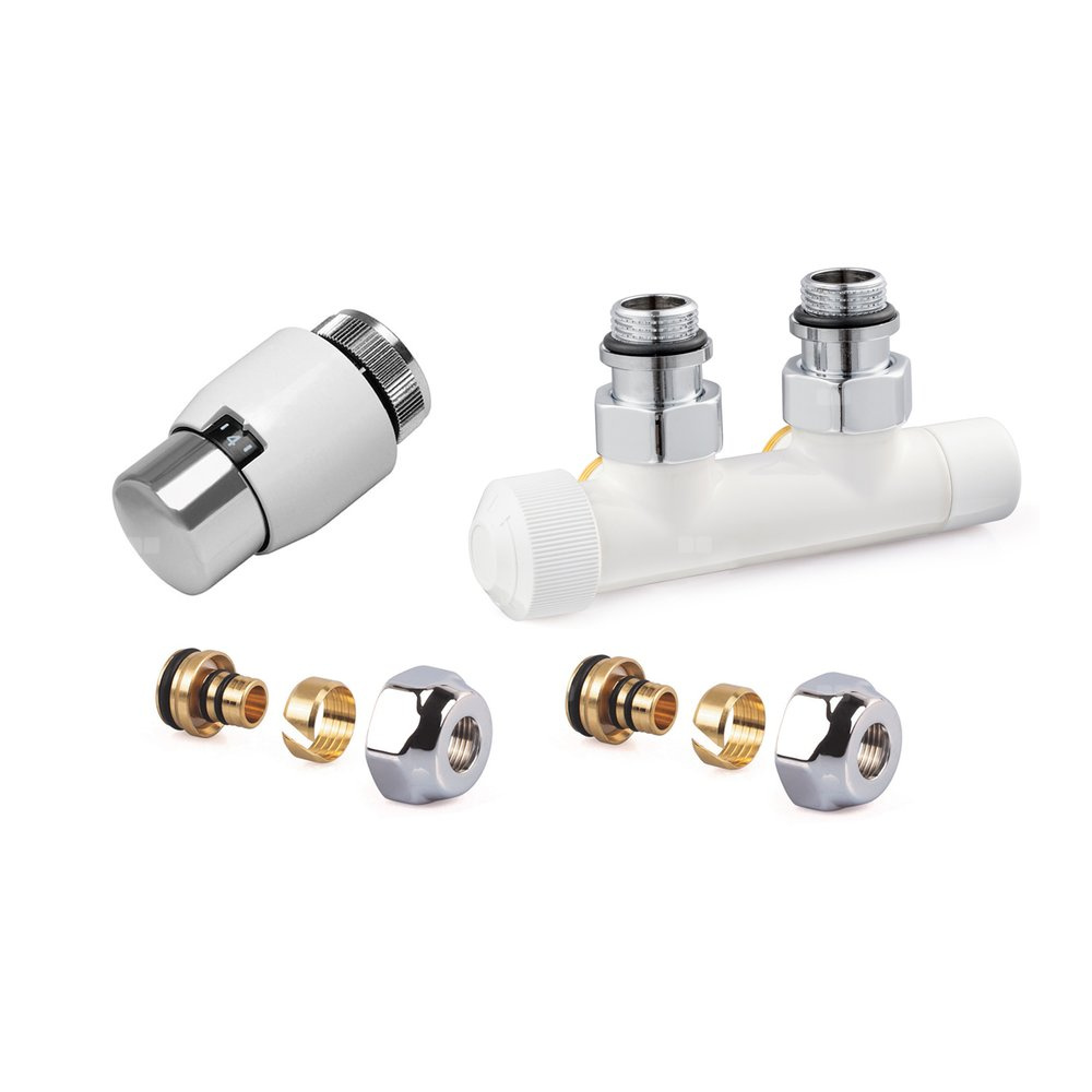 Zestaw BIAŁY do grzejników dolnozasilanych: głowica Thera-200 (biała/chrom) T4021, zawór podwójny, kątowy lewy, V2881LSL15A + 2x złączka do rur wielowarstwowych FEM24M16X2