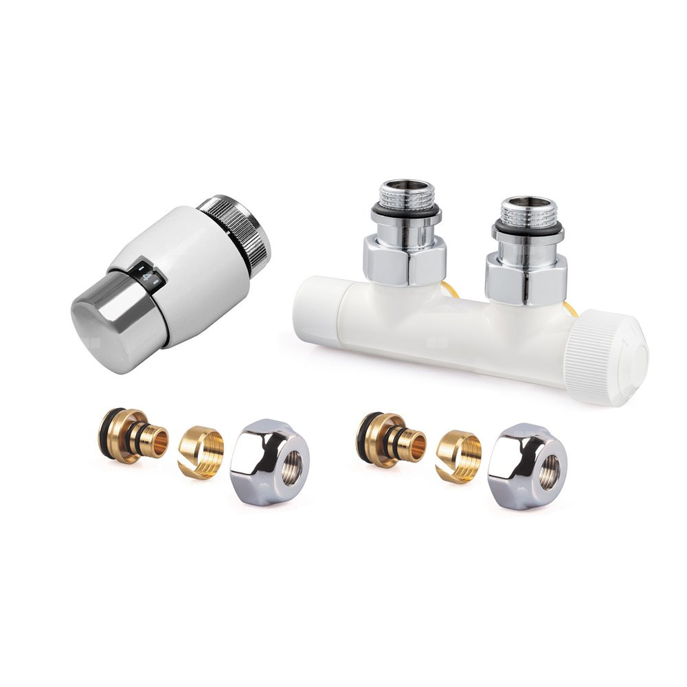 Zestaw BIAŁY do grzejników dolnozasilanych: głowica Thera-200 (biała/chrom) T4021, zawór podwójny, kątowy prawy, V2881RSL15A + 2x złączka do rur wielowarstwowych FEM24M16X2