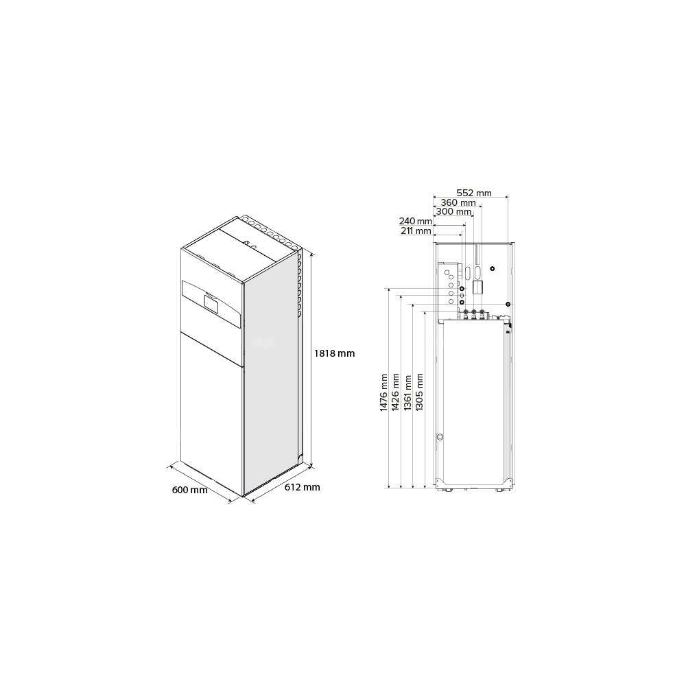 Kompaktowa jednostka wewnętrzna – o wymiarach 600x600 mm, z wbudowanym zasobnikiem o pojemności 180 litrów, zabezpieczonym anodą aktywną oraz powiększoną wężownicą.