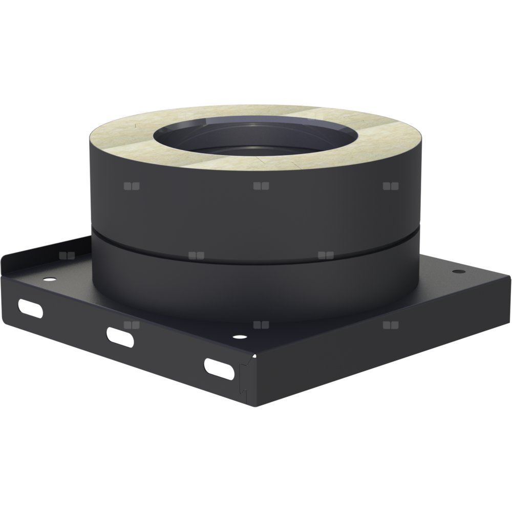 Płyta fundamentowa systemu izolowanego Jeremias DW-BLACK (grubość izolacji 50mm) lakierowana na czarno, jest elementem bazowym instalacji kominowej, na którym montowane są kolejne elementy pionowej części układu kominowego. Do ściany budynku element ten jest montowany za pośrednictwem wsporników komina.