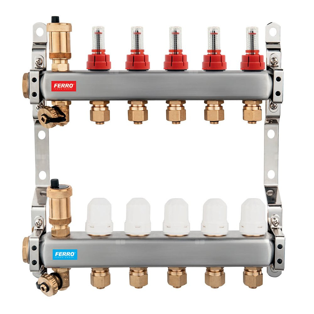 Rozdzielacz 4-drogowy z zaworami termostatycznymi, przepływomierzami i złączkami, stal nierdzewna