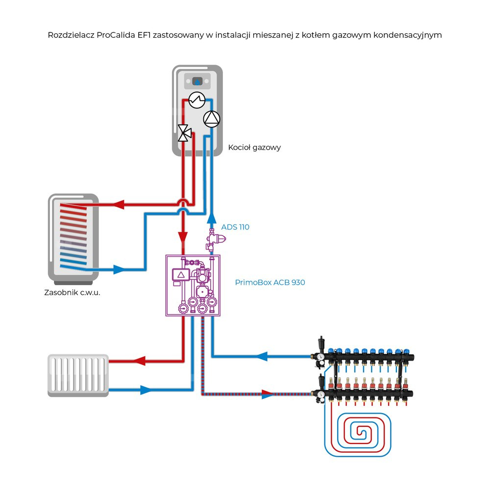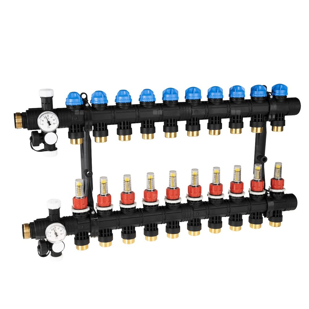 - Rozprowadza ciepło/chłód ze źródła na poszczególne pętle instalacji płaszczyznowej.