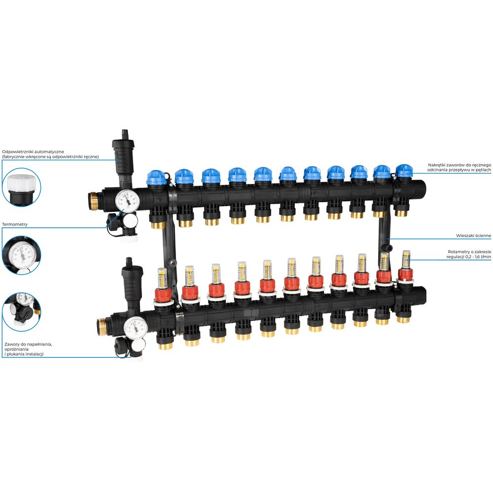 - Rozprowadza ciepło/chłód ze źródła na poszczególne pętle instalacji płaszczyznowej.