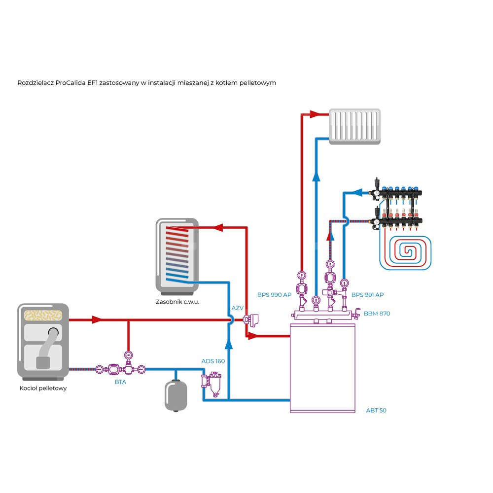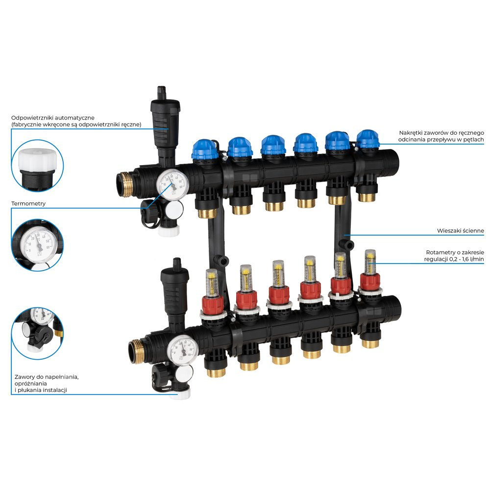 - Rozprowadza ciepło/chłód ze źródła na poszczególne pętle instalacji płaszczyznowej.