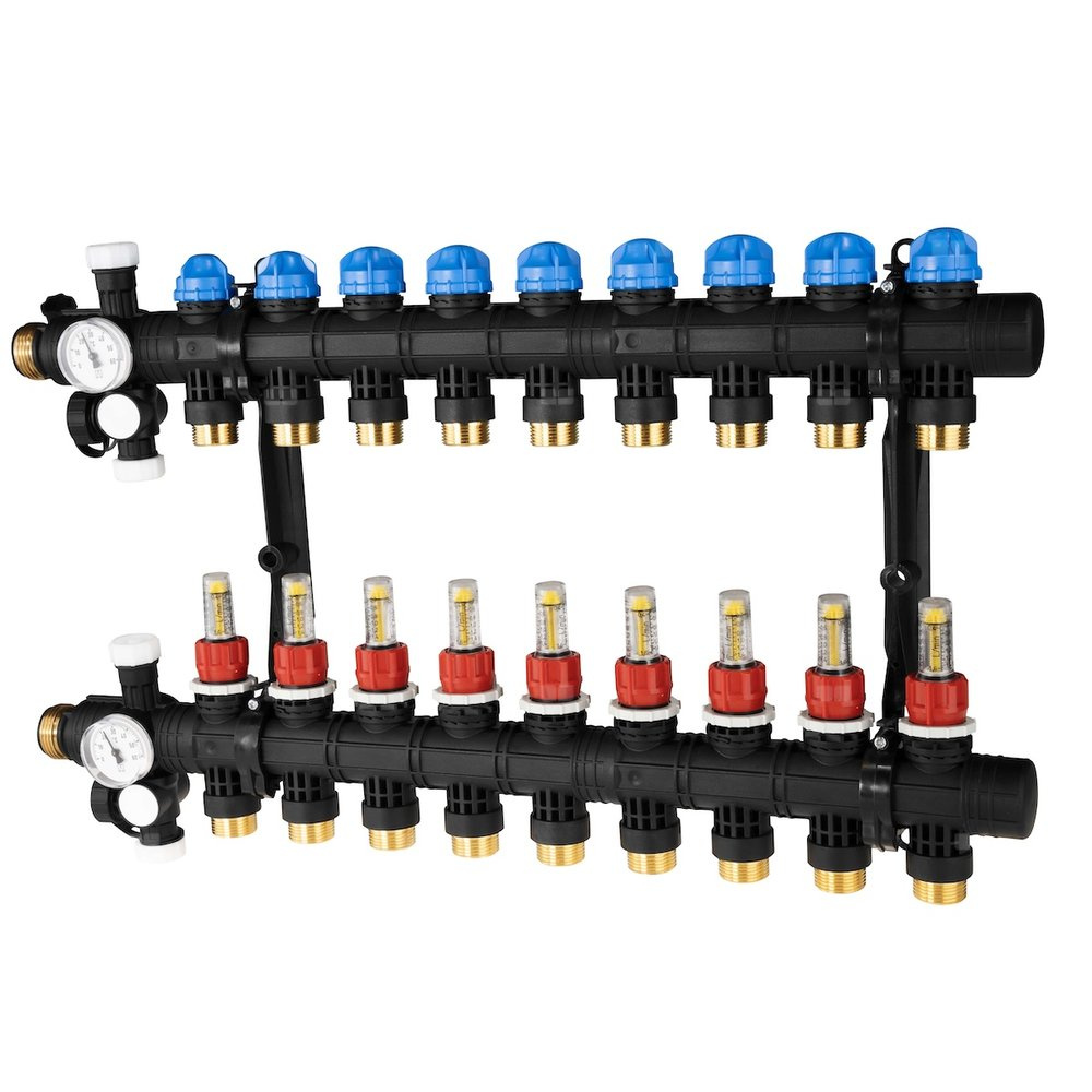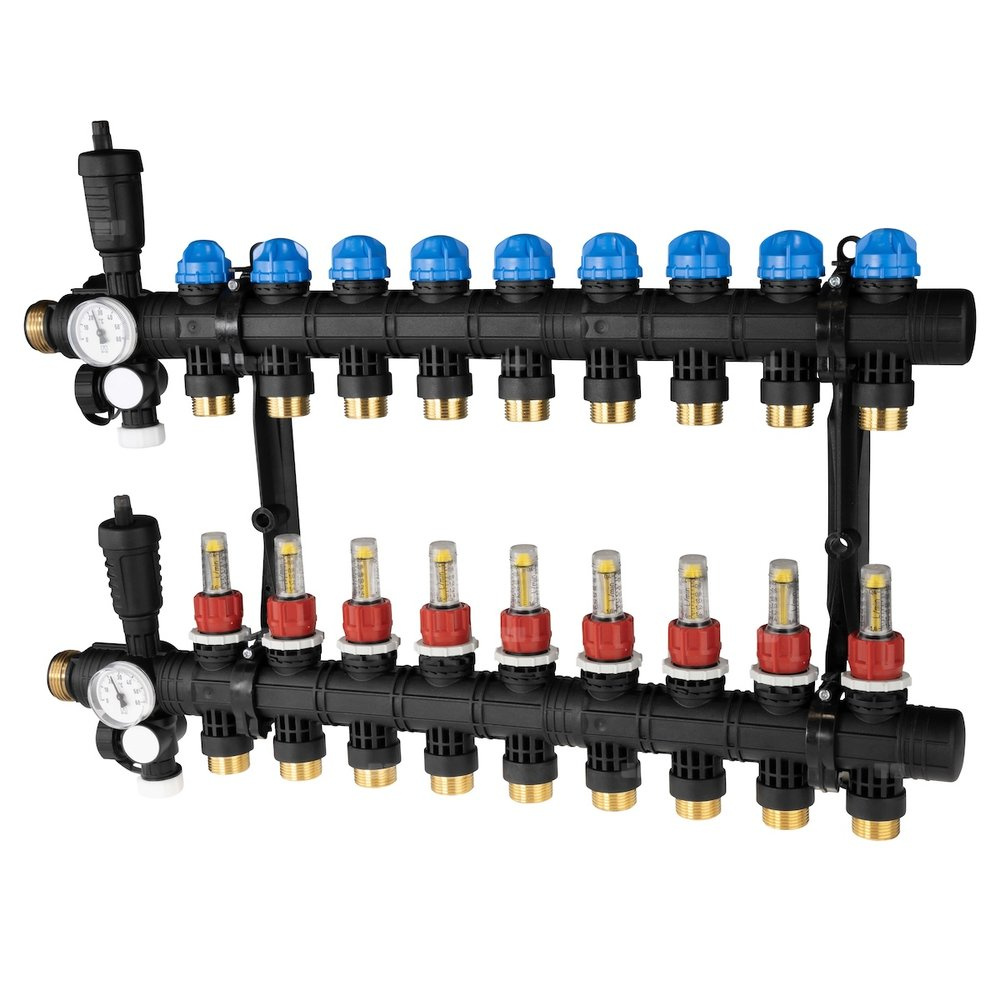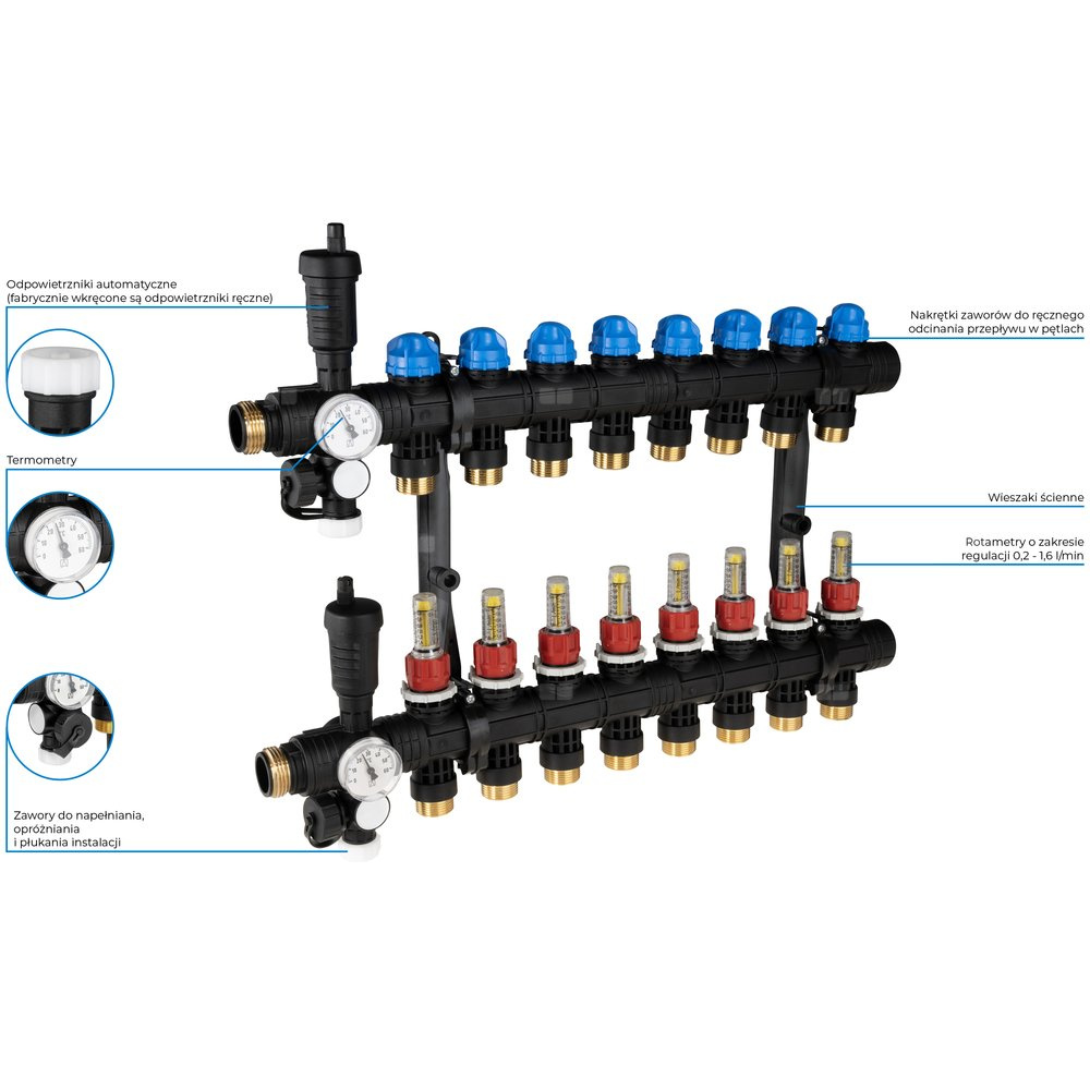 - Rozprowadza ciepło/chłód ze źródła na poszczególne pętle instalacji płaszczyznowej.