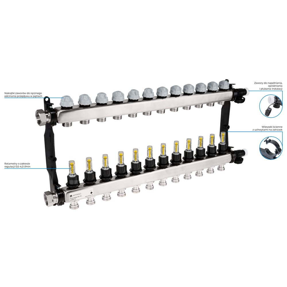 Rozdzielacz do ogrzewania podłogowego AFRISO ProCalida VA 1C 12-obieg. stal nierdzewna GZ 1'' x euroconus 3/4''