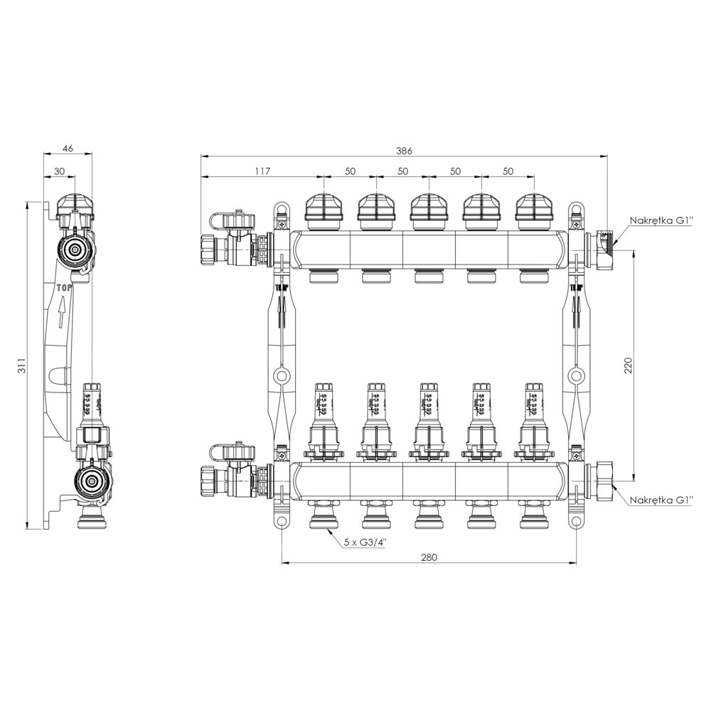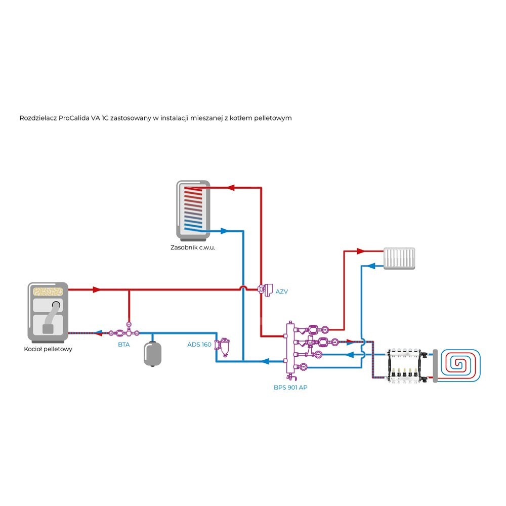 - Rozprowadza ciepło / chłód ze źródła na poszczególne pętle instalacji płaszczyznowej.