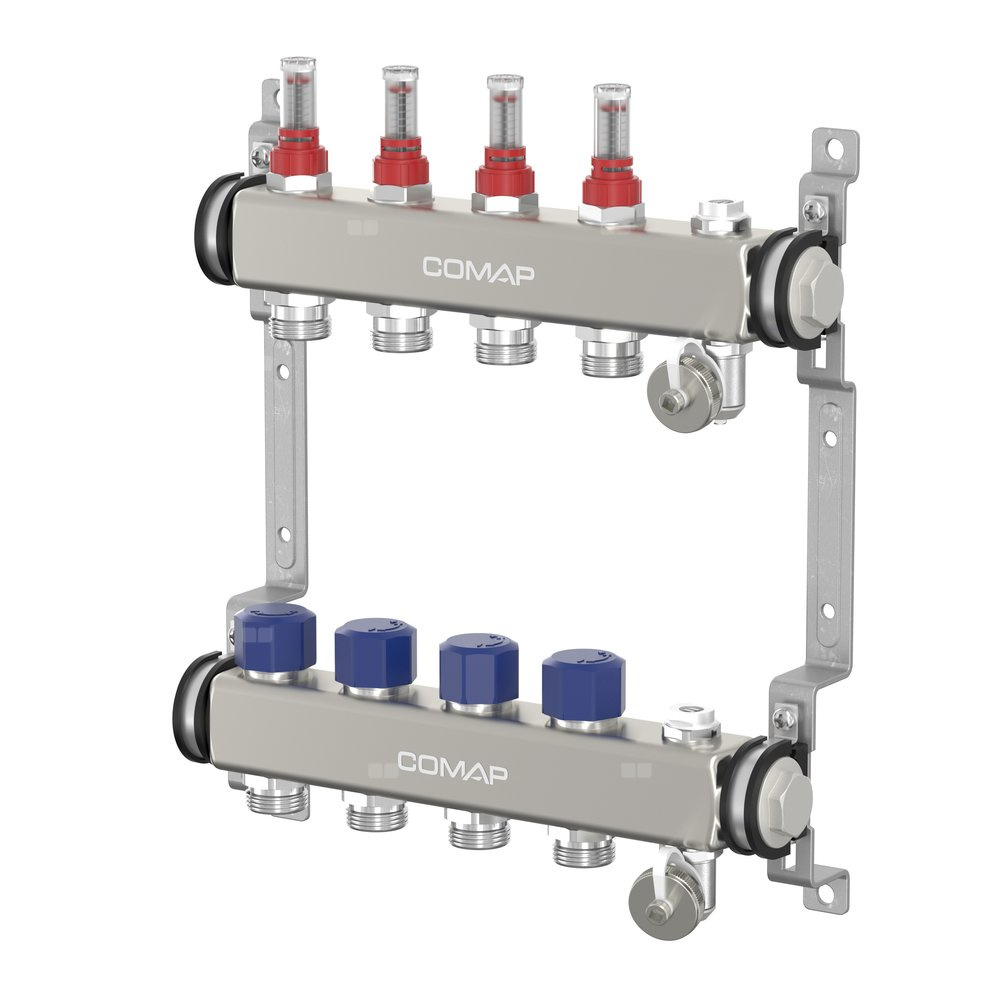 Specjalnie zaprojektowany do ogrzewania i chłodzenia powierzchniowego. Kompaktowy rozdzielacz ze stali nierdzewnej reguluje dopływ i odpływ wody ze źródła i rozdziela wodę w sposób jednorodny. Każdy obwód jest indywidualnie zrównoważony hydraulicznie. Komponenty