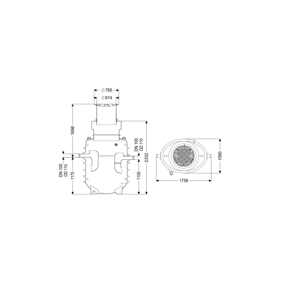 Odstęp między dnem rury dopływowej a dnem zbiornika: 1175 mm